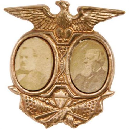 <B>Grover Cleveland: A Showy Jugate Pinback Badge for Cleveland with his 1888 Running Mate Allen Thurman.</B></I> Great condition, with lustrous brass shell frame and pictures sharper than usually seen. Width: 34mm, height 32mm.<BR><BR><b>Shipping:</b> Miscellaneous Collectibles, Smal (<a target="_blank" href="http://www.heritageauctions.com/common/shipping.php">view shipping information</a>)