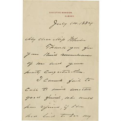 <B>Grover Cleveland Autograph Letter Signed as Governor of New York</B></I> “<I>Grover Cleveland</B></I>”. One page, 4.5” x 7”, on Executive Mansion letterhead, Albany, July 14, 1884, to a “<I>Miss Wheeler</B></I>”. Cleveland writes in part: “<I>Thank you for your kind remembrance of me and your hearty congratulations…I cannot fail to call to mind anther good friend, who would have rejoiced, if she had lived to see my honorable preferments</B></I>.” The paper has slightly toned and the letter has the usual fold creases, else a fine letter dating from just before Cleveland’s first term as President of the United States. <I>Ex. Henry E. Luhrs Collection</B></I>.<BR><BR><BR><BR><b>Shipping:</b> Flat Material, Small (<a target="_blank" href="http://www.heritageauctions.com/common/shipping.php">view shipping information</a>)
