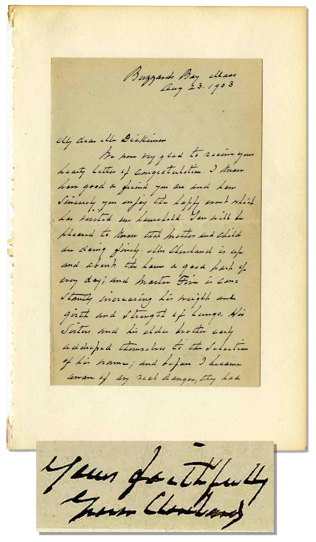 Grover Cleveland autograph letter signed, with good content on both the birth of his son and also problems with his former Cabinet. Datelined Buzzards Bay, Mass., 23 August 1903, 3pp. letter reads in small part, ''…the poor, helpless child [has] the name 'Francis Grover'…I am anxious to [correct] the accusation that I have mislead friends and placed them in a false position…I tried you and Carlisle [former Treasury Secretary] but got but little comfort from either of you…'' 4.25'' x 6.75''. Edges of last page mounted, else very good.