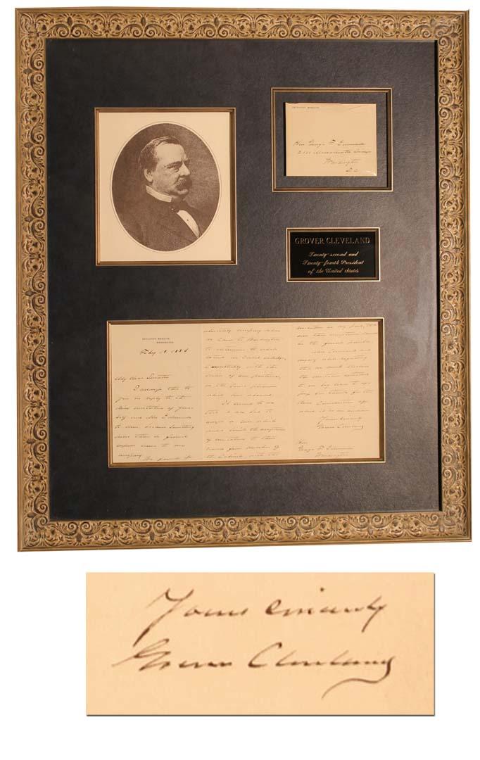Grover Cleveland autograph letter signed as President, dated 18 February 1886, shortly after assuming office. On Executive Mansion stationery, addressed to George F. Edmunds, letter reads in part, ''My dear Senator…It seemed to us that is was best to adopt a rule which would limit the acceptance of invitations…Yours Sincerely, Grover Cleveland''. Silver frame with regal blue-colored mat measures 22.5'' x 26.75''. Letter, on three pages, measures 13'' x 7''. Includes portrait engraving and original envelope. Near fine.