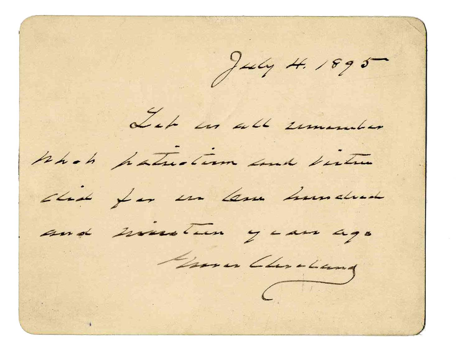 Grover Cleveland autograph quotation signed as President, dated 4 July 1895. The moving Fourth of July tribute commemorates America's Independence and reads: ''Let us all remember what patriotism and virtue did for us one hundred and nineteen years ago''. With a bold, clear ''Grover Cleveland'' signature. Quotation is written on thick cardstock measuring 4.25'' x 3.5'' with rounded edges and minor toning throughout. Some mounting remnants on verso, though not visible from front. Near fine condition.