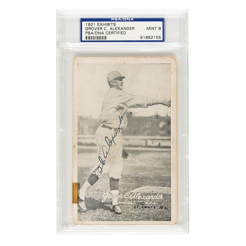 Sought-after 1921 Exhibit ‘border’ baseball card of Grover Cleveland Alexander, signed nicely across his uniform in fountain pen, “G. C. Alexander.†The postcard-sized vintage card shows the Hall of Famer hurler in a nearly full-length pose as he makes a toss in his Chicago Cubs uniform, with the lower section bearing his name in cursive above his position, team, and league, which another hand has struck through in ink and added below, “St. Louis, AL,†dating the signature to between 1926 and 1929. In very good to fine condition, with light soiling, and a small old tape stain to the lower left edge. Encapsulated by PSA/DNA, with the signature graded "MINT 9."