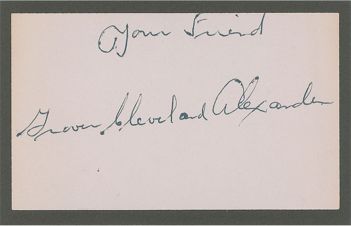 One of the greatest pitchers in baseball history, he won 30 games each season from 1915 to 1917 and led the league in ERA five times. No other National League pitcher has surpassed his marks of 373 victories and 90 shutouts. Vintage ink signature, “Your friend, Grover Cleveland Alexander,” on an off-white 5 x 3 card. Upper portion of the card is affixed to a slightly larger black board. In fine condition. Quite a rare find for Alexander to sign fully, including his entire middle name.