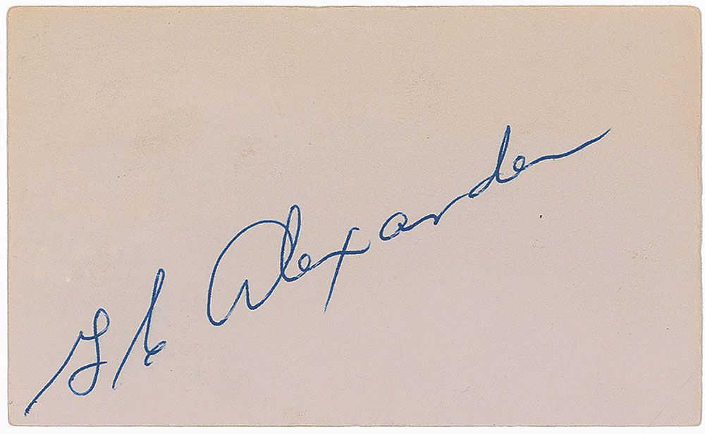 One of the greatest pitchers in baseball history, he won 30 games each season from 1915 to 1917 and led the league in ERA five times. No other National League pitcher has surpassed his marks of 373 victories and 90 shutouts. Vintage ballpoint signature, “G. C. Alexander,” on an off-white 5 x 3 card. In fine condition.