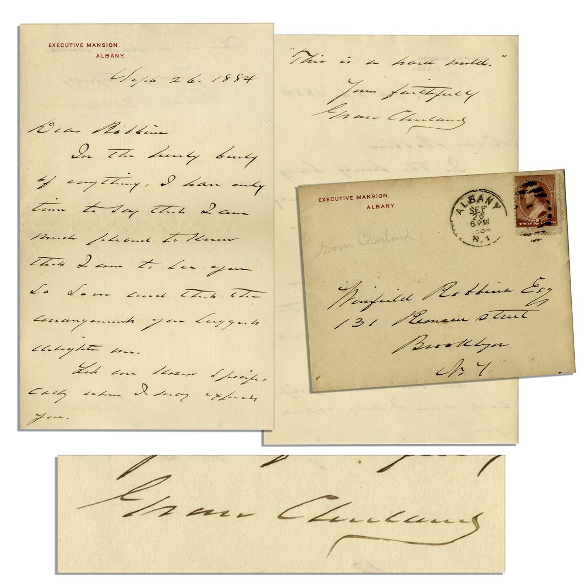 Grover Cleveland autograph letter signed as New York Governor and Democratic candidate for President. Dated 26 September 1884 upon Executive Mansion, Albany stationery, he writes to his friend Winfield Robbins, ''Dear Robbins, In the hurly burly of everything, I have only time to say that I am much pleased to know that I am to see you...the arrangements you suggest delight me. Let me know specifically when I may expect you. 'This is a hard world.' Yours faithfully, Grover Cleveland''. 2pp. on a single sheet, front and verso of card-style stationery. Measures 5'' x 7.75''. Toning and creasing, else near fine.