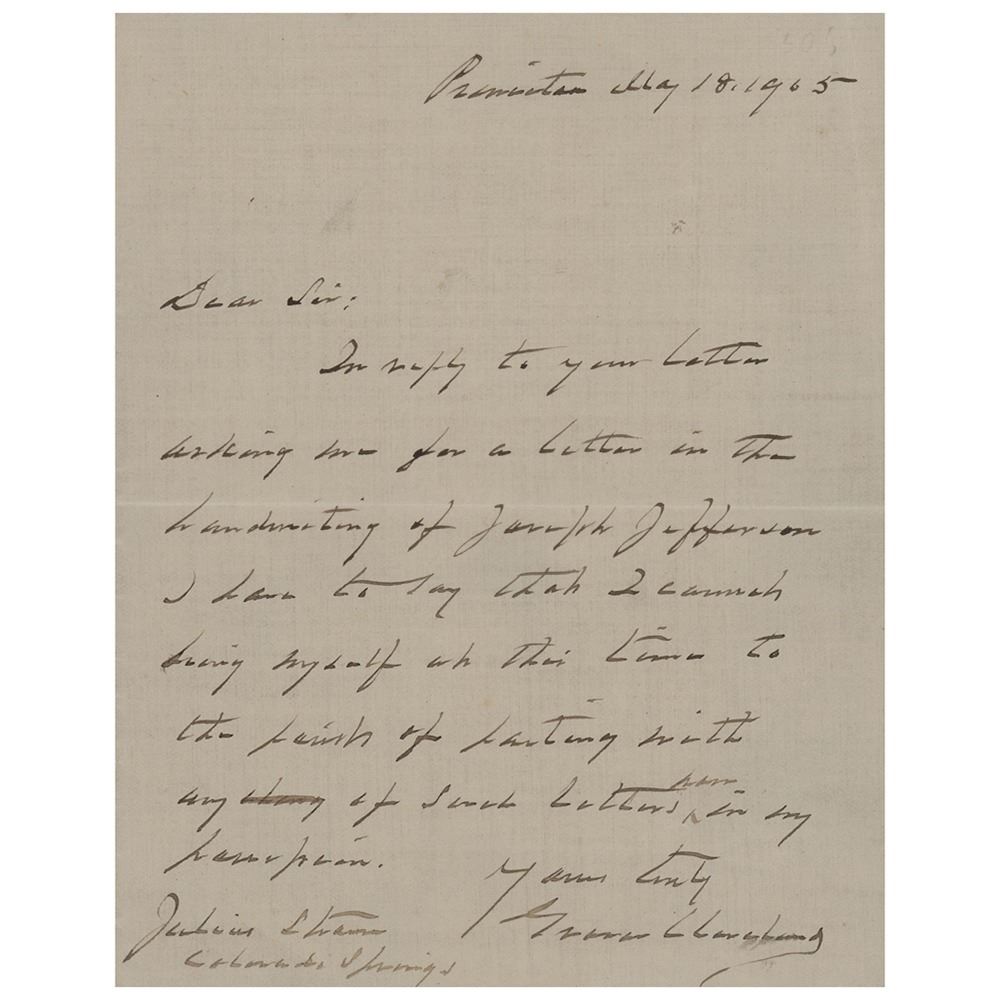 ALS, one page, 5.25 x 6.5, May 18, 1905. Handwritten letter to a collector from Colorado Springs, in full: "In reply to your letter asking me for a letter in the handwriting of Joseph Jefferson I have to say that I cannot bring myself at this time to the perish of parting with any of such letters now in my possession." In fine condition.