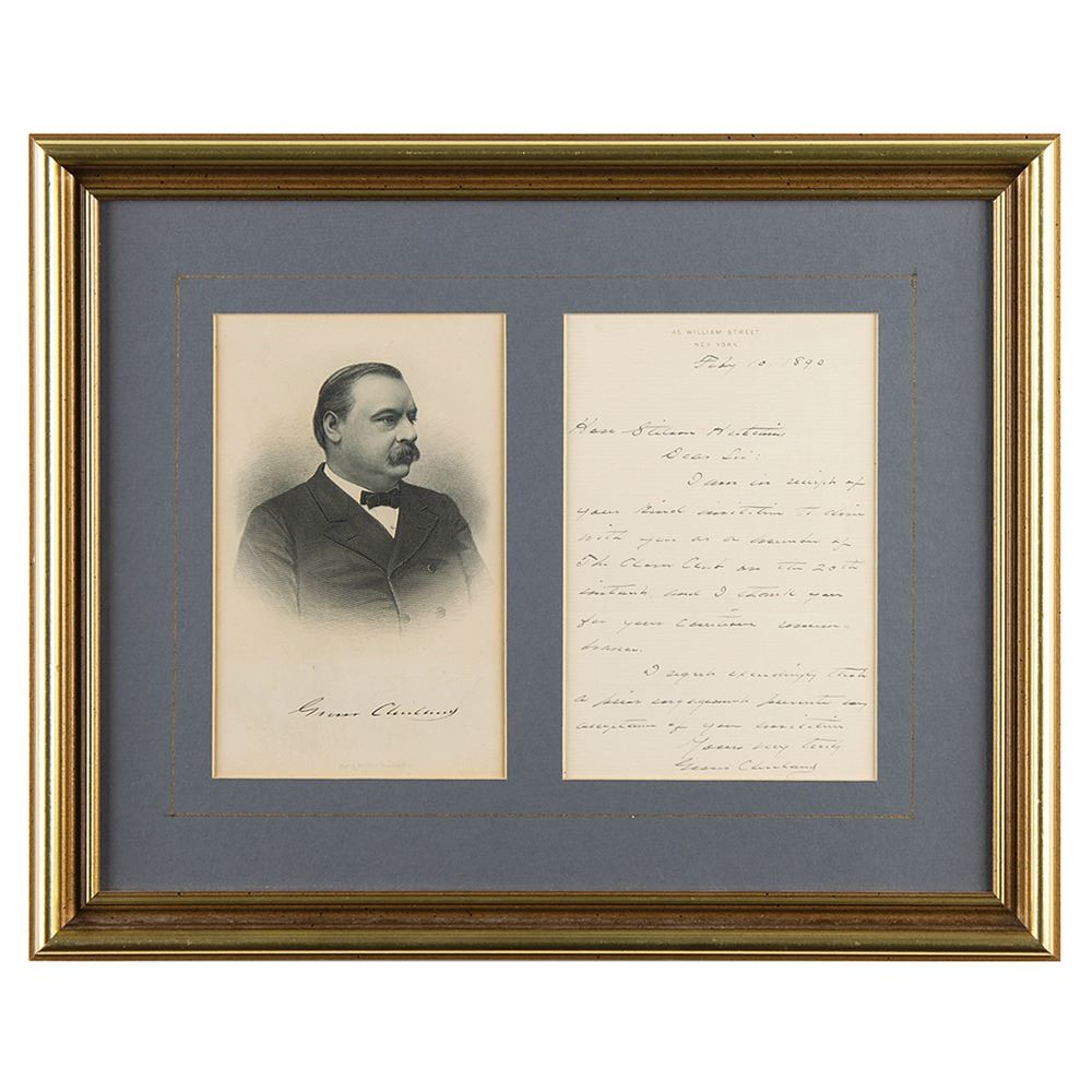 ALS, one page, 4.75 x 7.25, February 10, 1890. Handwritten letter to Stilson Hutchins, founder of the Washington Post. In part: "I am in receipt of your kind invitation to dine with you as a member of The Class Club on the 20th instant, and I thank you for your continuous remembrance. I regret exceedingly that a prior engagement prevents my acceptance of your invitation." Nicely matted and framed with an engraved portrait (bearing a facsimile signature) to an overall size of 15.5 x 12.5. In fine condition.