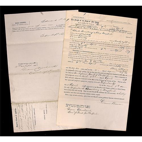<Our item number 139080><B>Cleveland, Grover.</B> Two partly-printed documents signed as Commissioner of Deeds for Buffalo (New York), on a Summons and an Affidavit for the Superior Court of Buffalo, 3½pp, Buffalo, 4 Sept. 1860 and 10 Sept. 1862. Both documents concern the same case, in which Dennis Bowen represents the plaintiffs. A copy of the Sheriff's return is attached to the document. Fine. <BR>Estimated Value $300 - 500. <BR><BR>Our item number 139080<BR><IMAGES><P ALIGN="CENTER"><IMG SRC="http://www.goldbergcoins.net/liveauction/49jpegs/139080.jpg"> </P></IMAGES>