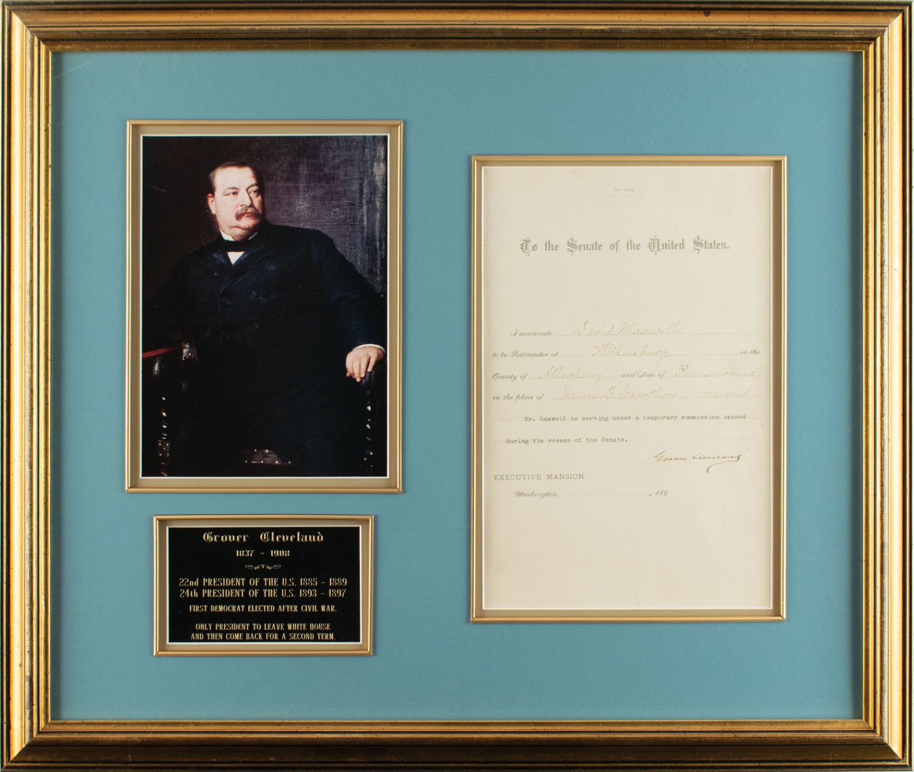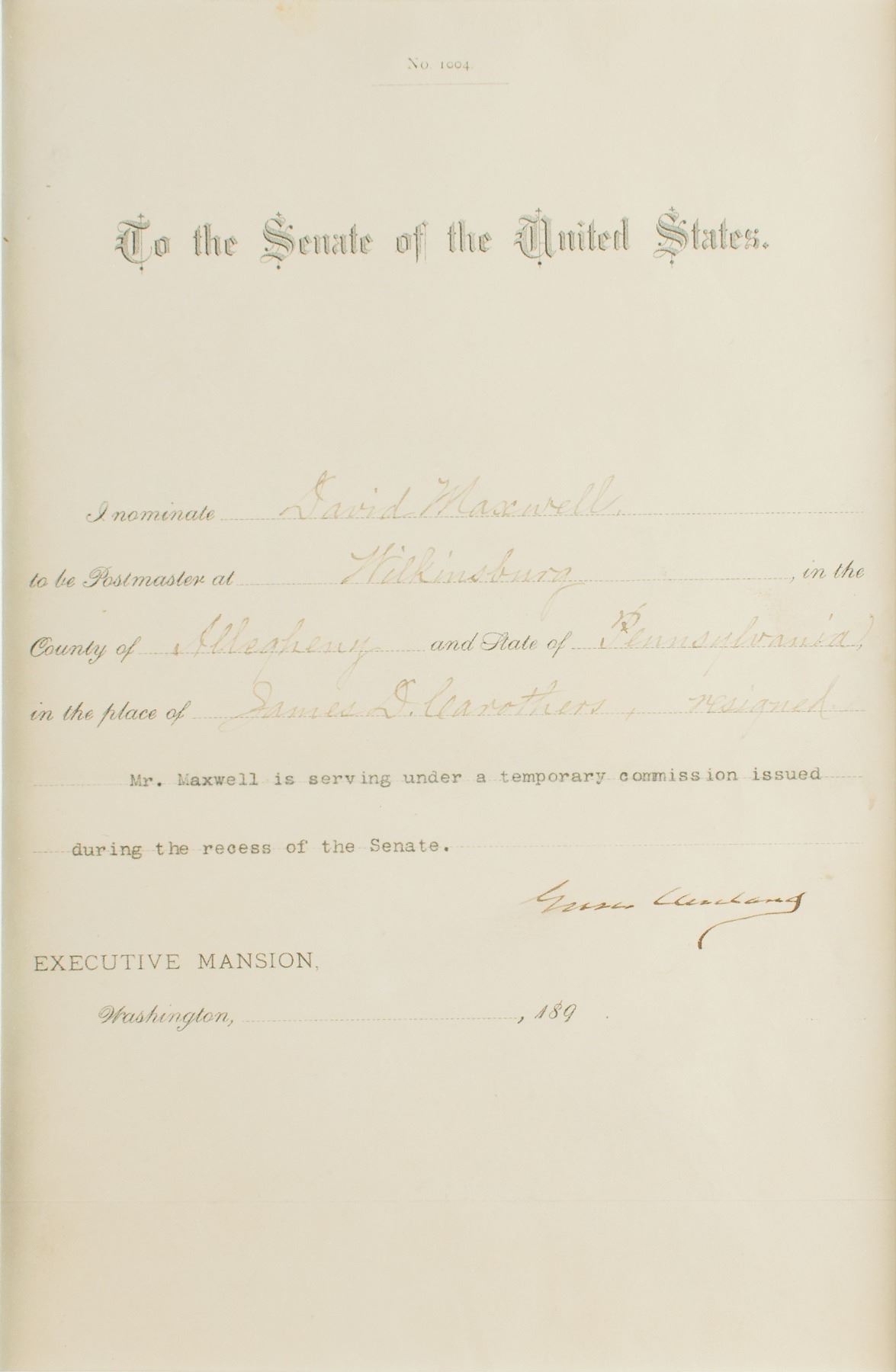 Partly-printed DS as president, one page, 7.5 x 11.5, no date. Nomination No. 1004, issued to the United States Senate, in full: "I nominate David Maxwell to be Postmaster at Wilkinsburg, in the County of Allegheny and State of Pennsylvania, in the place of James D. Carothers, resigned. Mr. Maxwell is serving under a temporary commission issued during the recess of the Senate." Signed at the conclusion by President Grover Cleveland. Matted and framed with an engraved plaque and a color portrait to an overall size of 24 x 20. In fine condition.