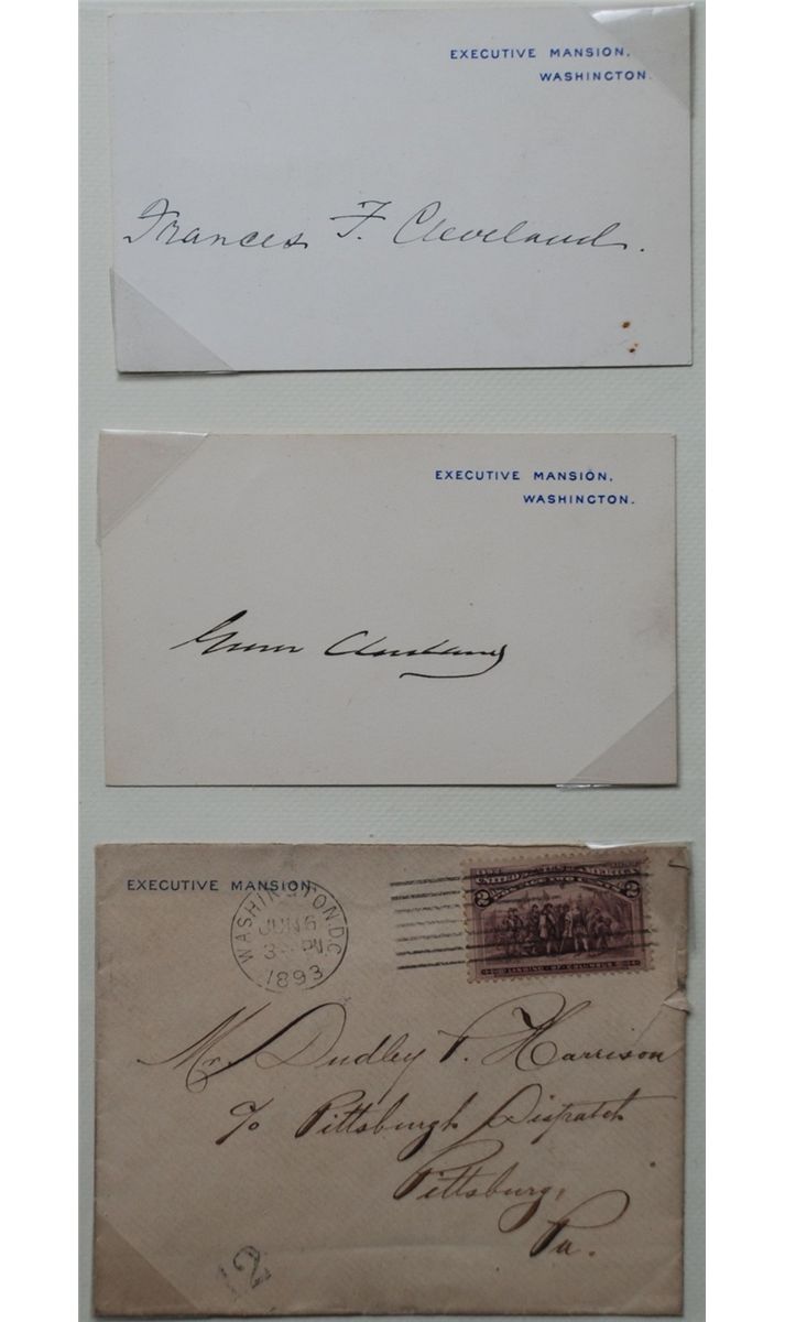 22nd and 24th President of the U.S. and First Lady. Two Executive Mansion cards – one signed by each. Excellent condition. With Executive Mansion envelope in which they obviously were mailed June 6, 1893.