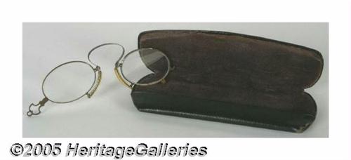<B>Grover Cleveland Reading Glasses</B></I> The Franklin & Co. of Washington, D.C. was a famed provider of eyeglasses to Presidents during the second half of the nineteenth century. Raleigh DeGeer Amyx visited their store one day to research an exhibit on Presidential prescription glasses which he was preparing. Once there he was directed to a drawer marked, "The President's Drawer." Inside was this vintage pair of pince-nez glasses which were marked that they had once belonged to President Grover Cleveland. Complete with Franklin & Co. embossed case, Amyx had the glasses tested for strength and a company prescription sheet indicates that they are +3.0 on both lenses. Included with the glasses is a typed letter signed by Raleigh DeGeer Amyx, detailing the history as well as his acquisition of the Cleveland glasses. Lot:254