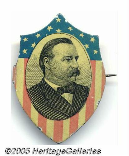 <B>Grover Cleveland Shield Shaped Tin Pin</B></I> Quite a lovely, colorful item: a lithographed tin shell with bright red and blue. Original pin-back intact, just light crazing on the front that is barely noticeable, a rare item. Lot:260