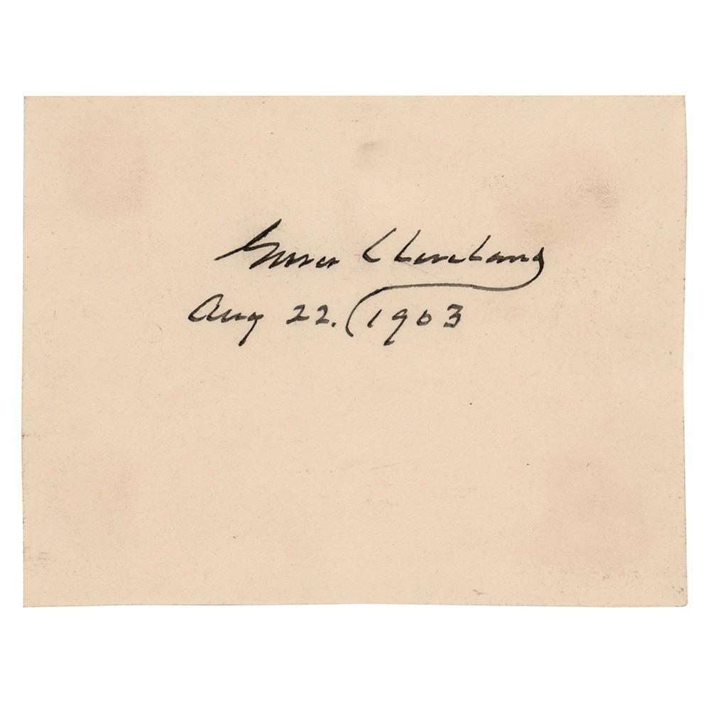 Bold ink signature, "Grover Cleveland, Aug. 22, 1903," on an off-white 4.25 x 3.25 slip. In very fine condition. Accompanied by an unsigned engraved portrait.