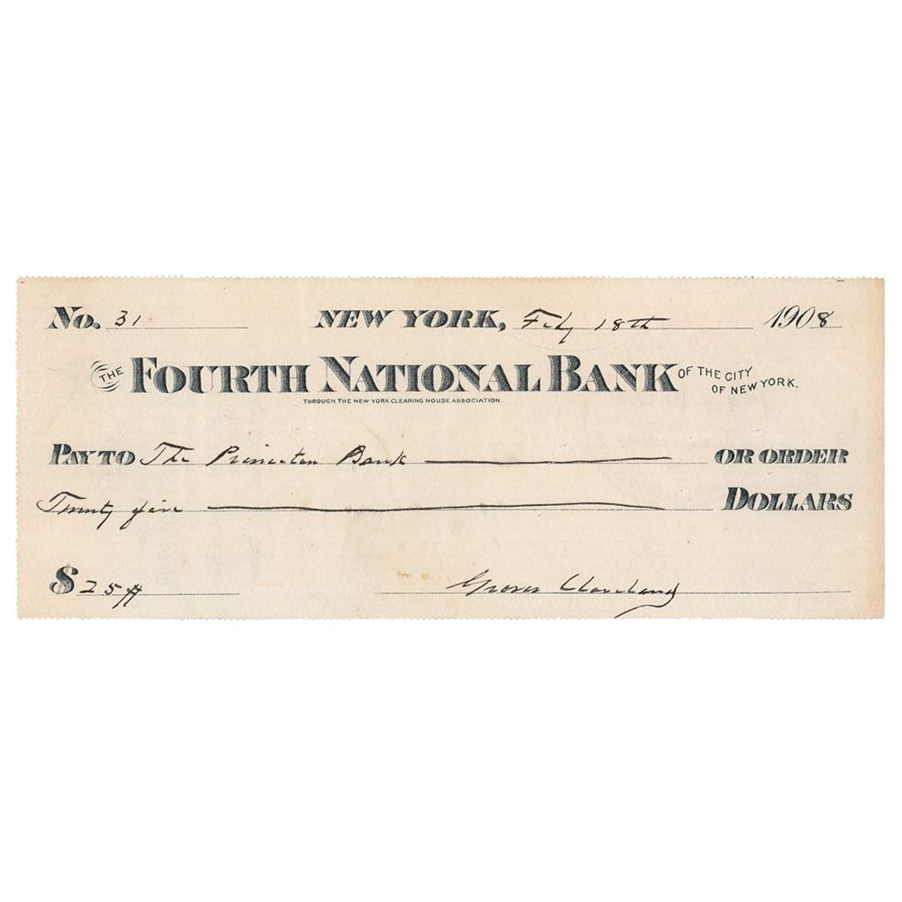 The Fourth National Bank check, 7.75 x 3, filled out and signed by Cleveland, "Grover Cleveland," payable to The Princeton Bank for $25, February 18, 1908. In fine condition.