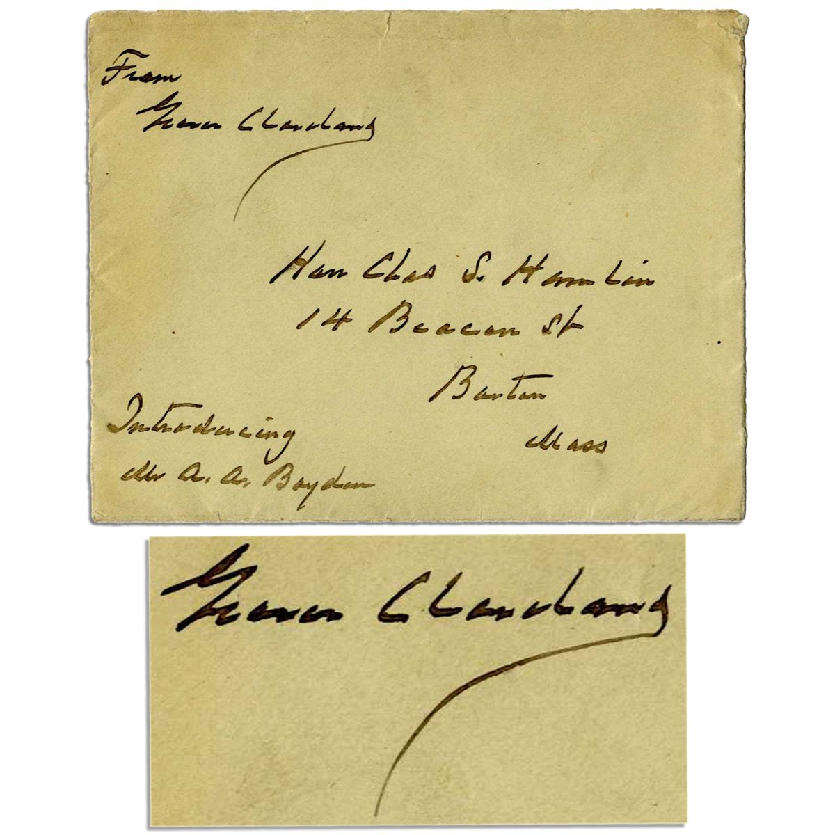 Grover Cleveland signed envelope. Upper left is signed, ''From Grover Cleveland'' and addressed in Cleveland's hand to ''Hon Chas S Hamlin / 14 Beacon St / Boston / Mass / Introducing Mr A. A. Baydon''. Measures 4.75'' x 3.75''. Toning and pencil notation to verso. Wear to flap hinge, else near fine.