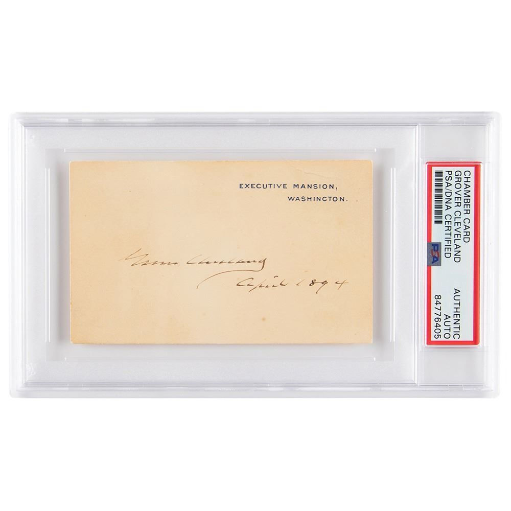 Executive Mansion card, 4.25 x 2.25, signed neatly in ink as president, "Grover Cleveland, April 1894." In very good to fine condition, with a crease to the upper right corner. Encapsulated in a PSA/DNA authentication holder.