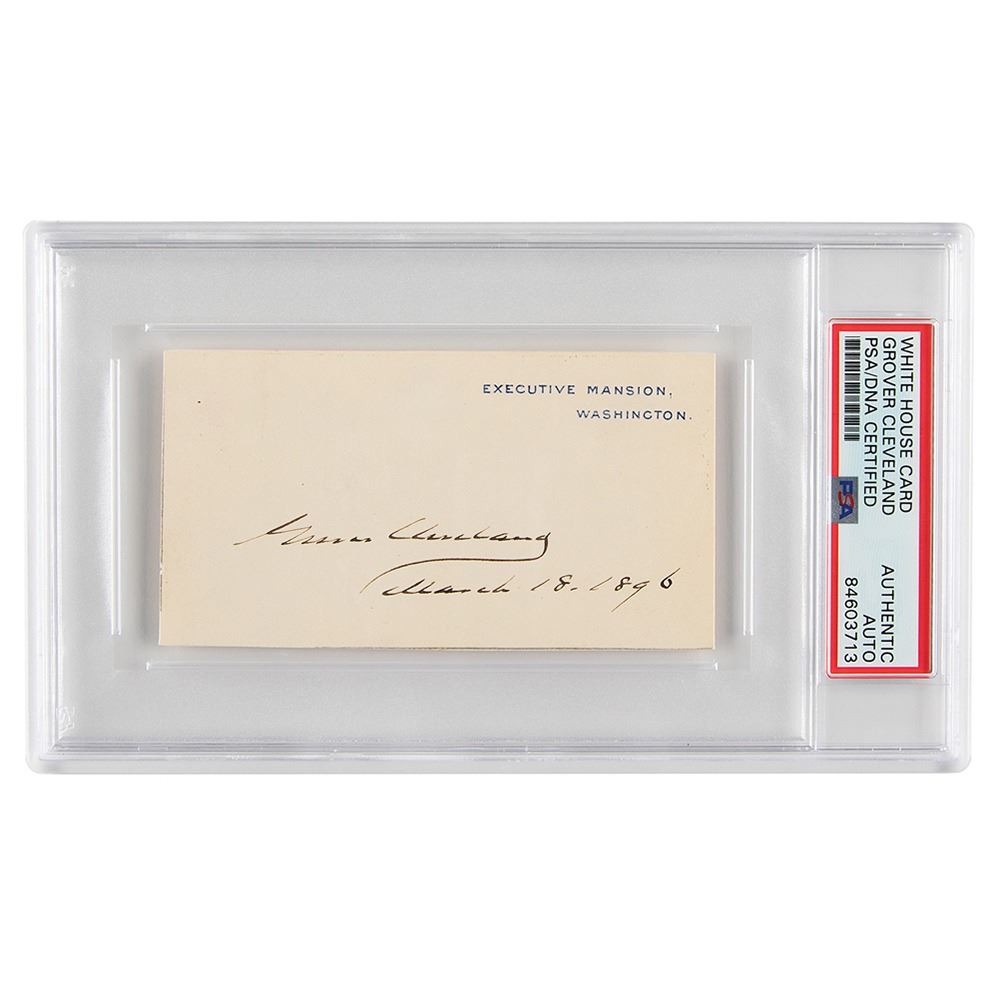 Executive Mansion card, 4.25 x 2.25, signed neatly in ink, "Grover Cleveland, March 18, 1896." In fine condition. Encapsulated in a PSA/DNA authentication holder.