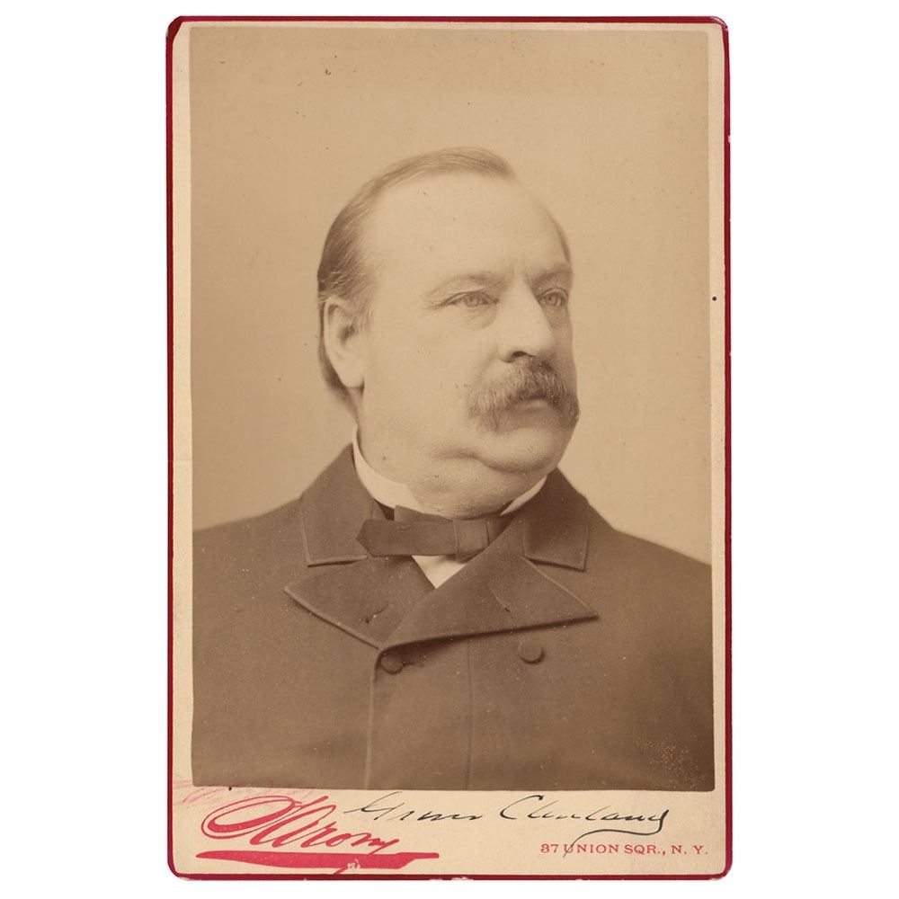 Handsome 4.25 x 6.5 cabinet card photo of Grover Cleveland, signed in the lower border in black ink. Published by the Otto Sarony Studio of New York. In fine condition, with a small crease to the left edge of the image.