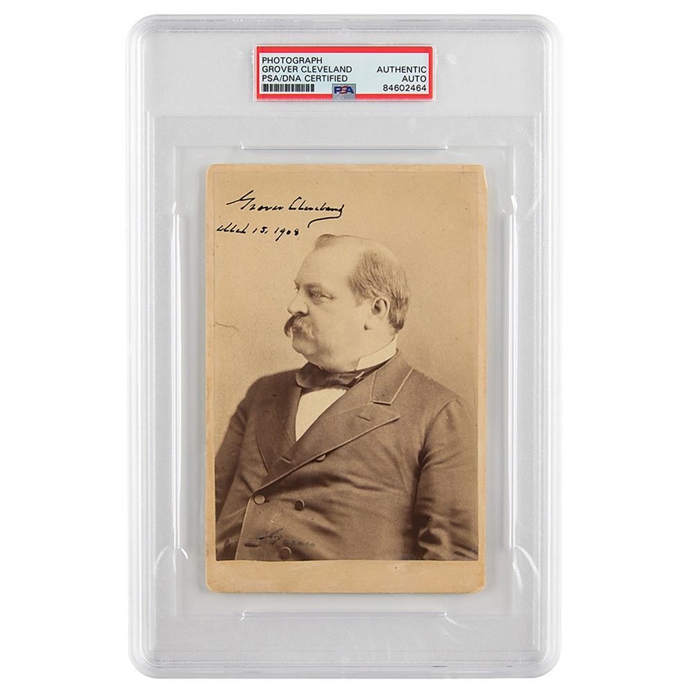 Desirable 4.25 x 6.5 cabinet photo of Cleveland by B. F. Powelson of Buffalo, signed in the upper left in black ink, "Grover Cleveland, Mch. 15, 1908." Cleveland began signing at the bottom of his jacket, which remains only slightly visible, and a newspaper article regarding his 71st birthday celebration is affixed to the reverse. In fine condition, with a superficial tear to the left border of the image (the mount unaffected), and the upper right corner of the mount trivially clipped. Encapsulated in a PSA/DNA authentication holder. This is a terrific specimen with a sharp, youthful image and bold signature, penned just three days before his 71st birthday and three months before his death.