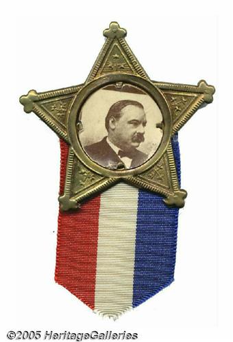 <B>Grover Cleveland Star Badge</B></I> A simple, elegant, "very 19th century" political item, a 3/4" in diameter cardboard photograph set into a brass star with red, white and blue ribbon adorning the piece. Original pin on verso, overall bright and clean. Not much to say save for the fact that these were once relatively attainable (old-time collectors might even have called them "common"), but are now increasingly difficult to find in such lovely condition. A classic, representative item! Lot:260