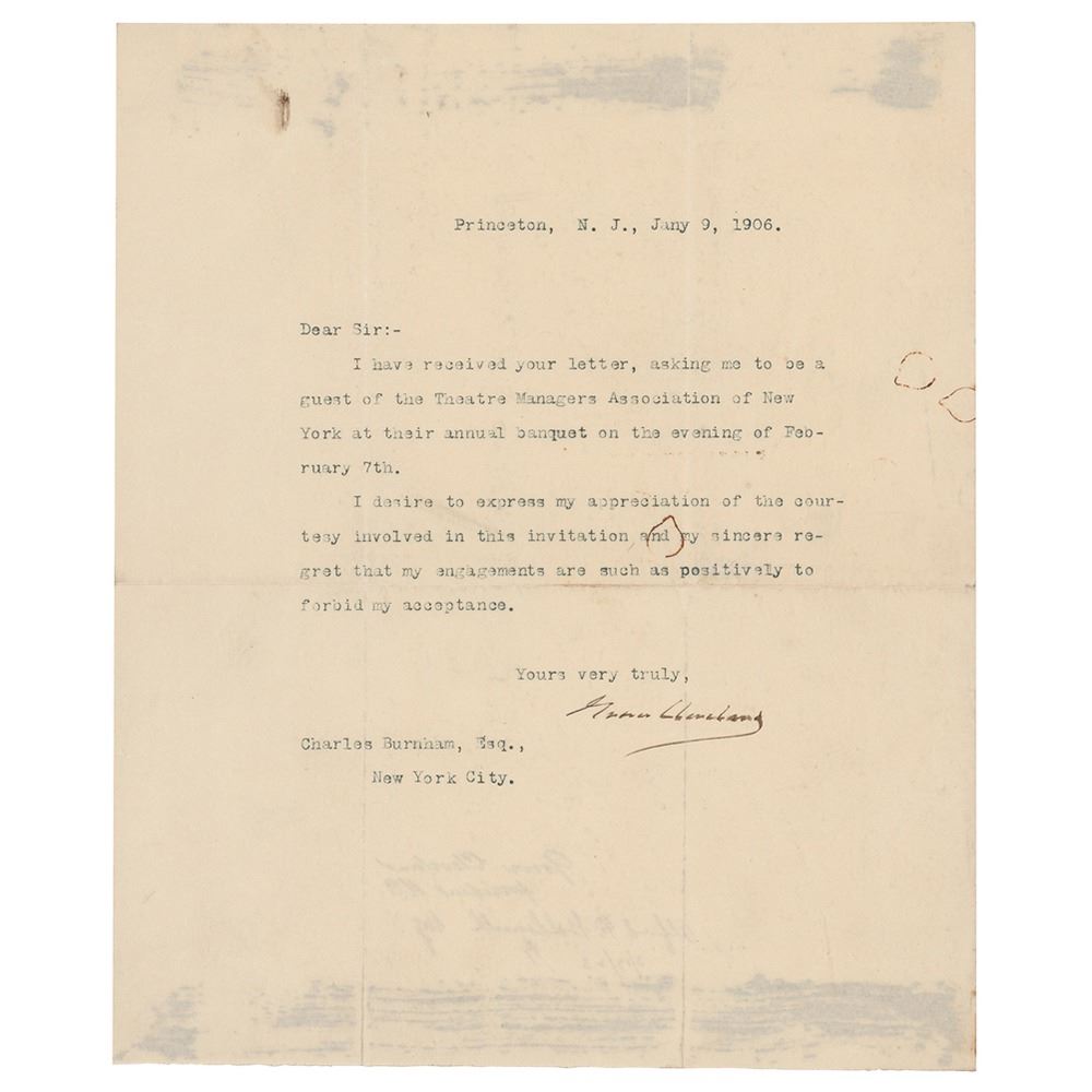 TLS, one page, 8.5 x 10.25, January 9, 1906. Letter to Charles Burnham, in part: "I have received your letter, asking me to be a guest of the Theatre Managers Association of New York at their annual banquet of February 7th. I desire to express my appreciation of the courtesy involved in this invitation and my sincere regret that my arrangements are such as positively to forbid my acceptance." In very good to fine condition, with several rusty paperclip impressions, and show-through at the top and bottom from old mounting residue on the back.