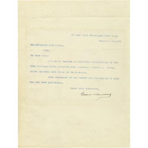 <B>Grover Cleveland Typed Letter Signed</B></I> in full. One page, 8" x 10.5", dated December 26, 1892, New York City. Cleveland (1837 -1908) was the 22nd (1885-1889) and 24th (1893-1897) president of the United States, and the only president to serve two non-consecutive terms. He was the only Democrat elected to the presidency in the era of Republican political domination between 1860 and 1912, after the American Civil War. His admirers praise him for his bedrock honesty, independence, integrity, and commitment to the principles of classical liberalism. As a leader of the Bourbon Democrats, he opposed imperialism, taxes, corruption, patronage, subsidies, and inflationary policies. The document has a clean signature and a slight tear in the upper right-hand corner.<BR><BR><b>Shipping:</b> Flat Material, Small (<a target="_blank" href="http://www.heritageauctions.com/common/shipping.php">view shipping information</a>)