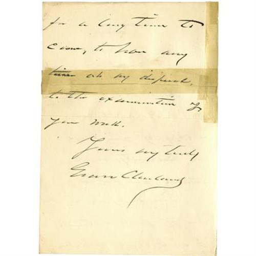 <B>Grover Cleveland White House Autograph Note Signed as President</B></I>. ANS, "<I>Grover Cleveland </B></I>", 4.5" x 6.25", 2 pages folded, Washington, D. C., May 23, 1885. Written in thanks for a book sent to President Cleveland, "<I>Executive Mansion Washington</B></I> " is printed at top of first page above the written date "<I>May 23, 1885</B></I> ". A section measuring 4.5" x 2" has been clipped from the top of the first page and reattached with tape on verso, along the center fold and across one line of script. Two folds, horizontal and vertical across two pages, with a light tear at bottom of center fold, light discoloration over all. Accompanied by other ephemera from previous collector.<BR><BR><BR><b>Shipping:</b> Flat Material, Small (<a target="_blank" href="http://www.heritageauctions.com/common/shipping.php">view shipping information</a>)
