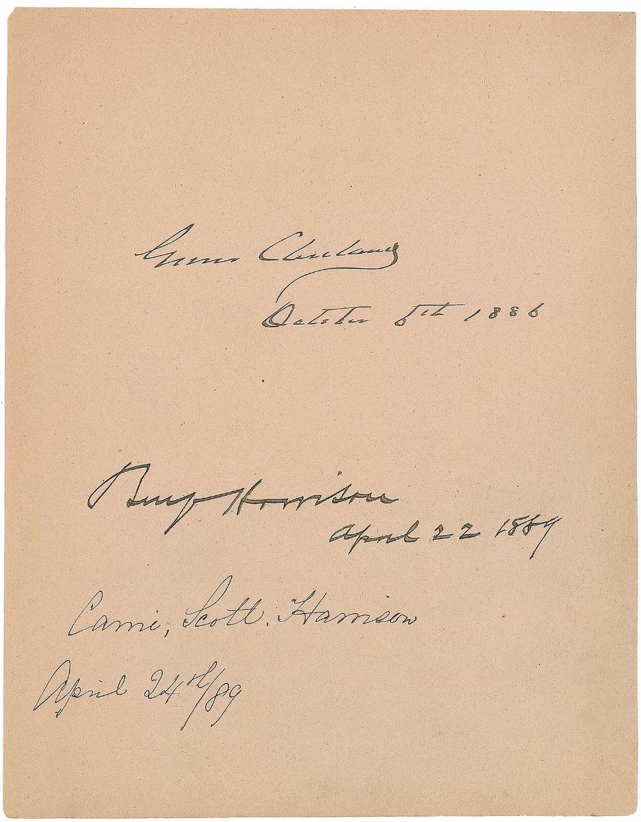 Desirable tandem of presidential signatures, both signed in ink on a beige 6.25 x 8 sheet, “Grover Cleveland, October 6th 1886” and “Benj. Harrison, April 22 1889.” Also signed below in ink, “Carrie Scott Harrison, April 24th/89.” Reverse bears ink signatures of William Jennings Bryan (affixed card) and James G. Blaine. In fine condition.