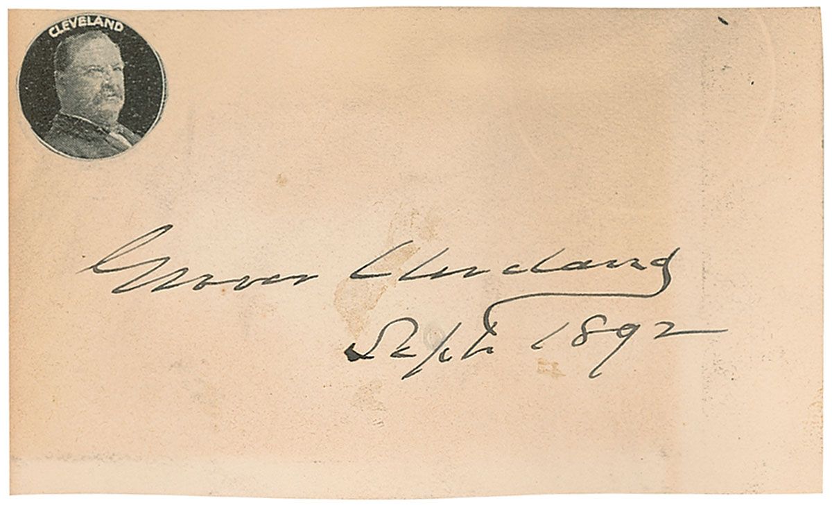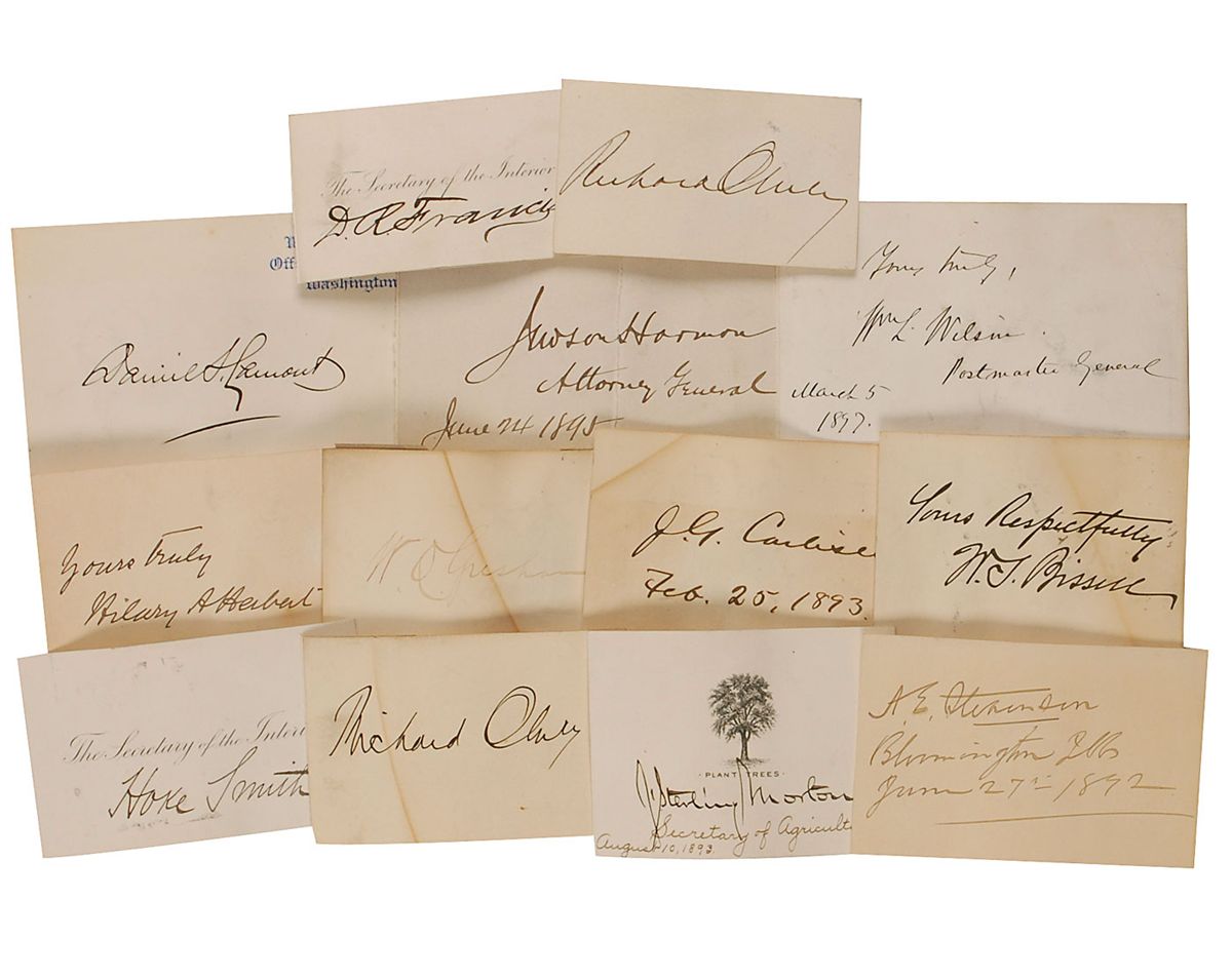 Ink signature, “Grover Cleveland, Sept. 1892,” on an off-white 3.5 x 2 card bearing a small clipped portrait affixed to the upper left. In very good condition, with scattered toning and soiling, light rippling, and mounting remnants to reverse. Accompanied by 13 cards, each signed by a member of his second term cabinet. Signers are: Wilson S. Bissell (2), Hilary A. Herbert, Adlai Stevenson I, David R. Francis, Judson Harmon, Richard Olney (2), Julius Sterling Morton, M. Hoke Smith, Daniel S. Lamont, John G. Carlisle, and Walter Q. Gresham. In overall very good condition, with various toning, soiling, creases, and rippling.