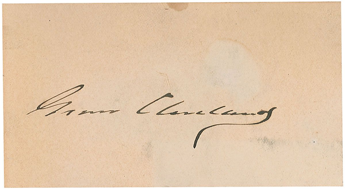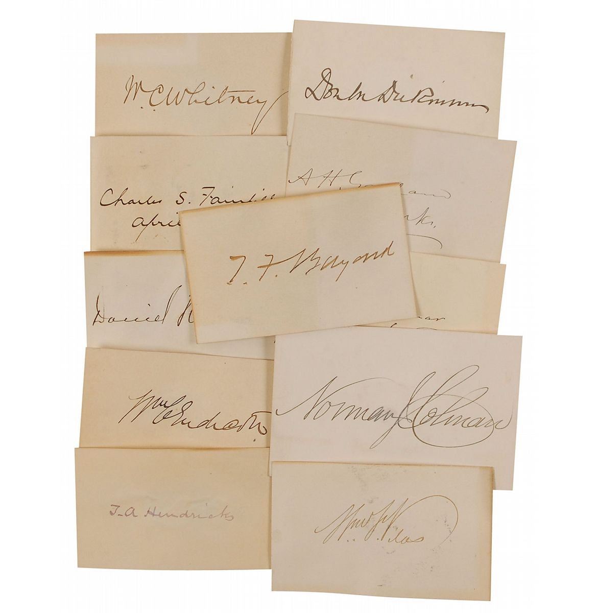 Ink signature, “Grover Cleveland,” on an off-white 3.75 x 2 card. In very good condition, with light overall toning and rippling, mild scattered soiling, and mounting remnants to reverse. Accompanied by 11 cards, each signed by a member of his cabinet. Signers are: Thomas F. Bayard, Thomas A. Hendricks, L. Q. C. Lamar, William Freeman Vilas, Norman Jay Coleman, William Crowninshield Endicott, Donald M. Dickinson, Augustus Hill Garland, William Collins Whitney, Charles S. Fairchild, and Daniel Manning. Light toning and soiling, otherwise overall fine condition.