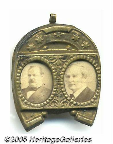 <B>Grover Cleveland and Thomas Hendricks Horseshoe Photo Badge</B></I> One of the classic cardboard and brass frame designs of the latter part of the 19th century. This presents the Democratic candidates of 1884 in a 26 mm x 35 mm campaign device. Tear to cardboard visible only from verso, typical age and wear, a better-than-average specimen. Lot:259
