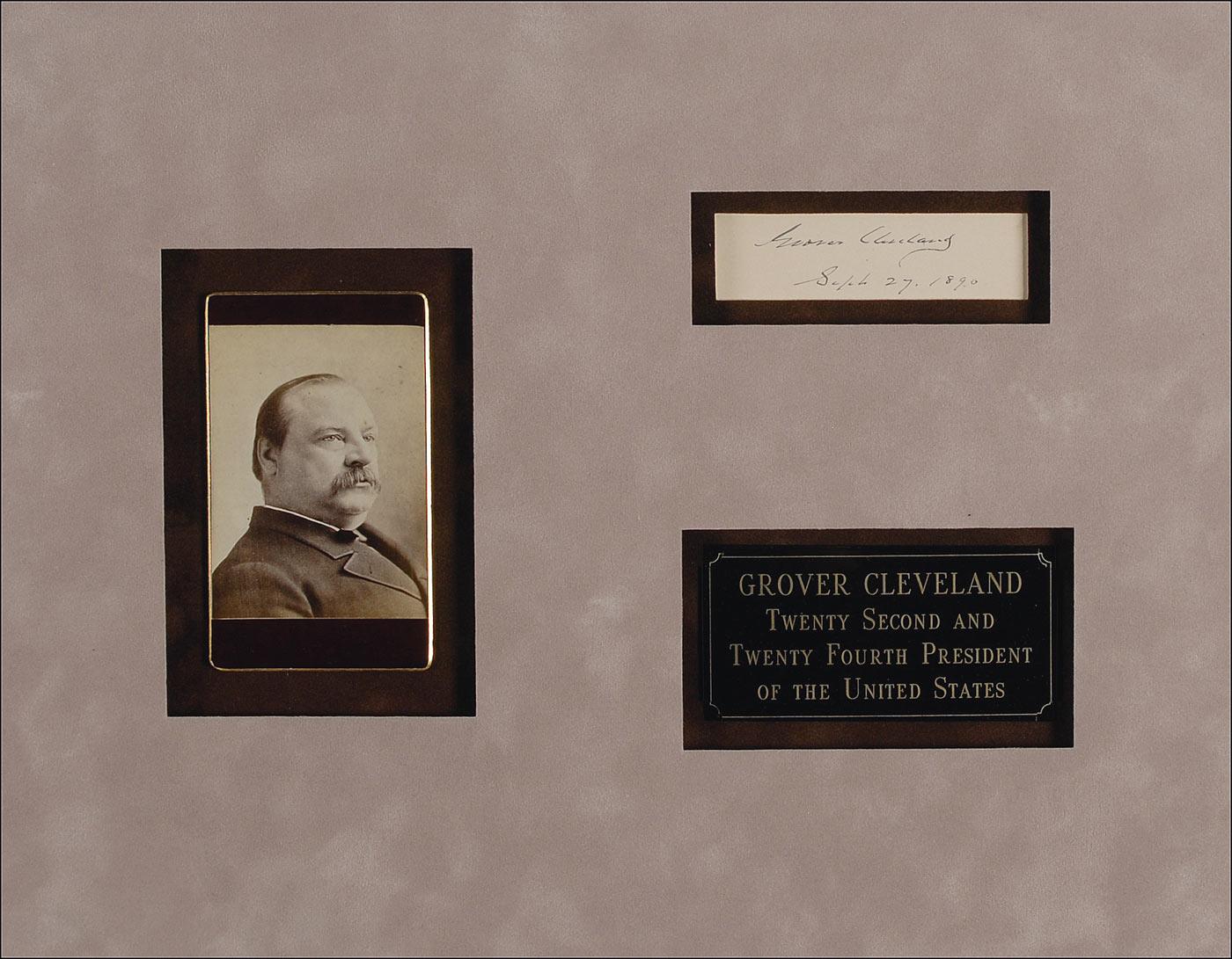 Vintage fountain pen signature, “Grover Cleveland, Sept. 27, 1890,” on an off-white 3.5 x 1 slip. Elaborately suede matted with a small vintage portrait and descriptive plaque. In fine condition.