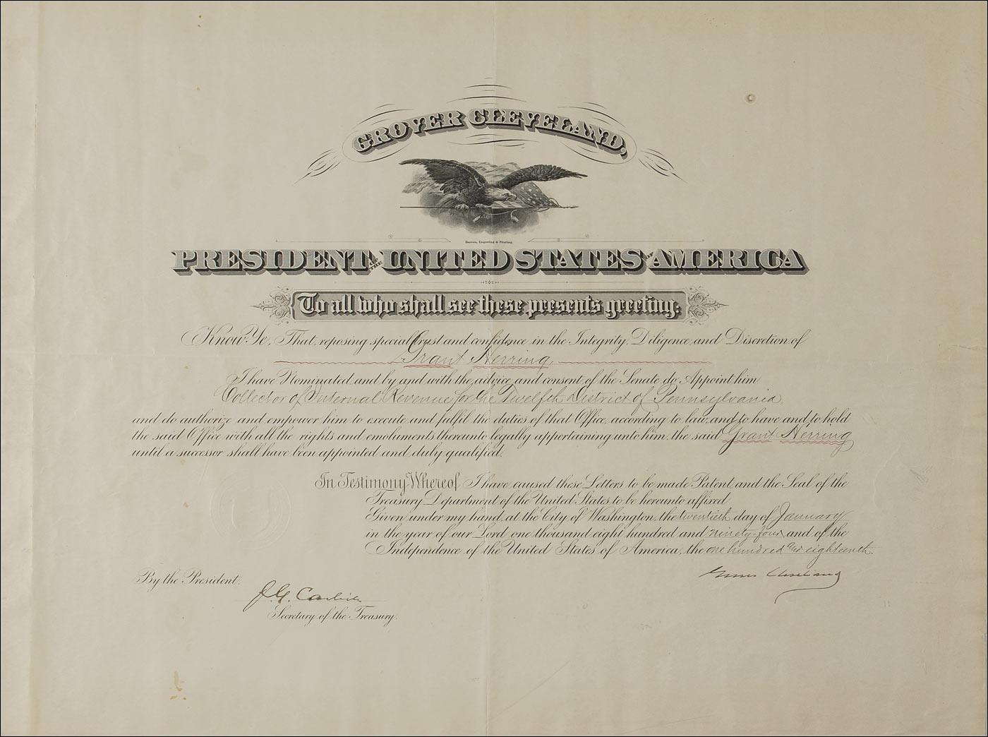 Partly-printed DS as president, one page, 21 x 16, January 20, 1894. President Coolidge appoints Grant Herring a “Collector of Internal Revenue for the Twelfth District of Pennsylvania.” Signed at the conclusion by Cleveland and countersigned by Secretary of the Treasury John Carlisle. In very good to fine condition, with intersecting folds, light overall toning, a few spots of soiling, and scattered light creases and wrinkles.
