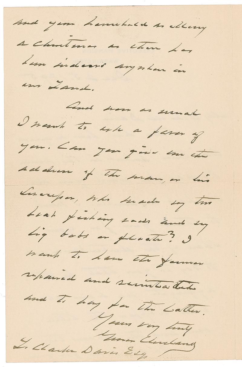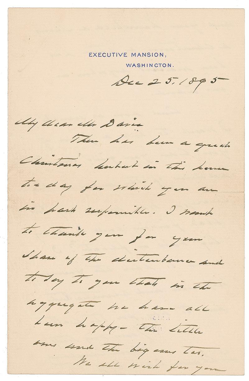 ALS as president, one page both sides, 4.5 x 7, Executive Mansion letterhead, December 25, 1895. A warm Christmas greeting from President Cleveland to L. Clark Davis, editor of the Philadelphia Public Ledger. In part: “This has been a great Christmas here in this house today for which you are in part responsible. I want to thank you for your share of the disturbance…We have all been happy—the little ones and the big ones too.” In very good condition, with separation along the center horizontal mailing fold, light wrinkling, uniform toning, and show-through from handwriting on the opposing sides. Accompanied by the original mailing envelope addressed by Cleveland.