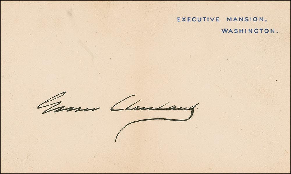 Signed Executive Mansion card, boldly signed in black ink, “Grover Cleveland.” In fine condition, with a uniform shade of toning, with a few scattered heavier spots.