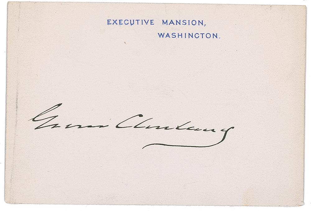 Signed 4 x 2.75 Executive Mansion card, nicely signed in fountain pen, “Grover Cleveland.” In fine condition, with a bit of mild toning, trivial ding to lower right corner, and a thin line down left edge.