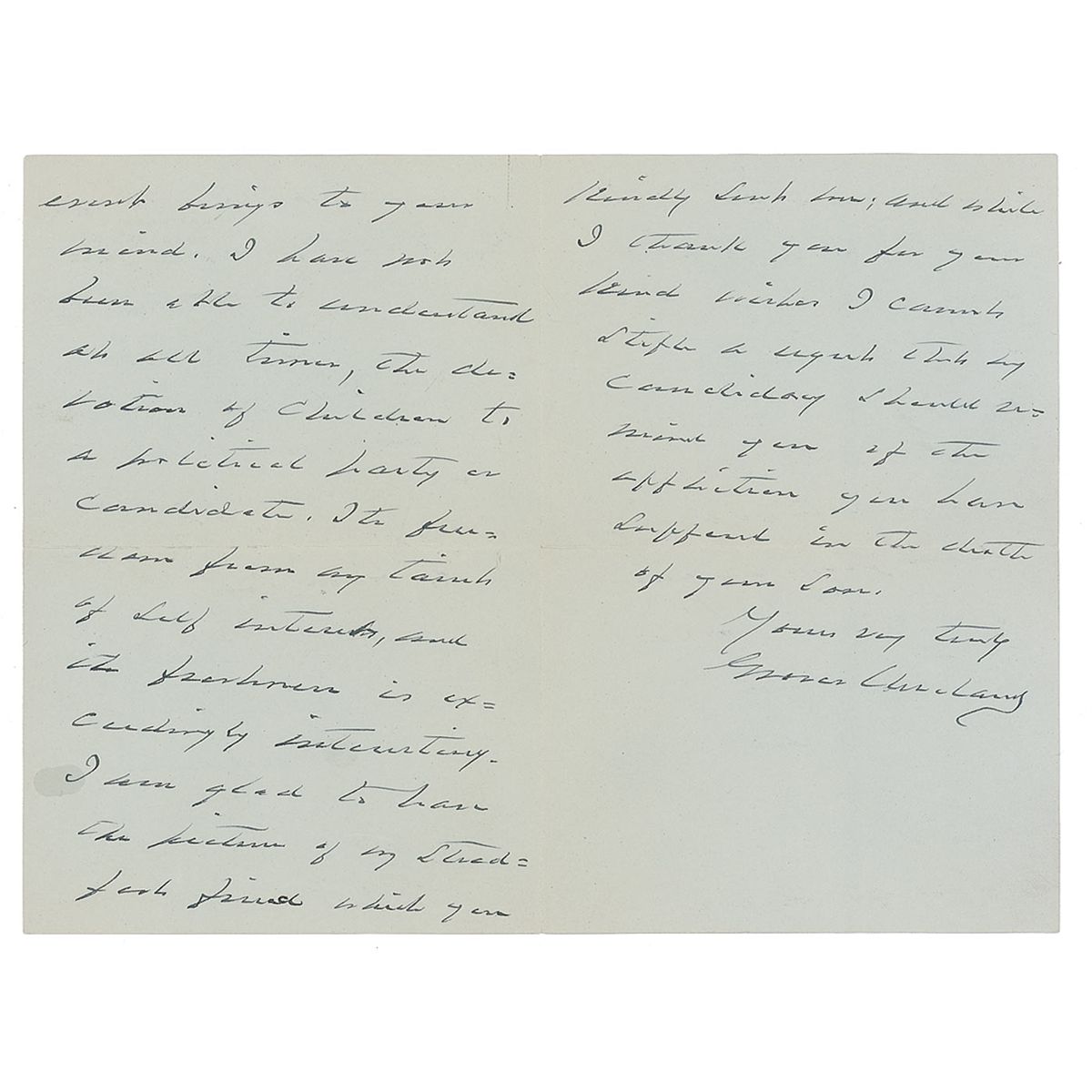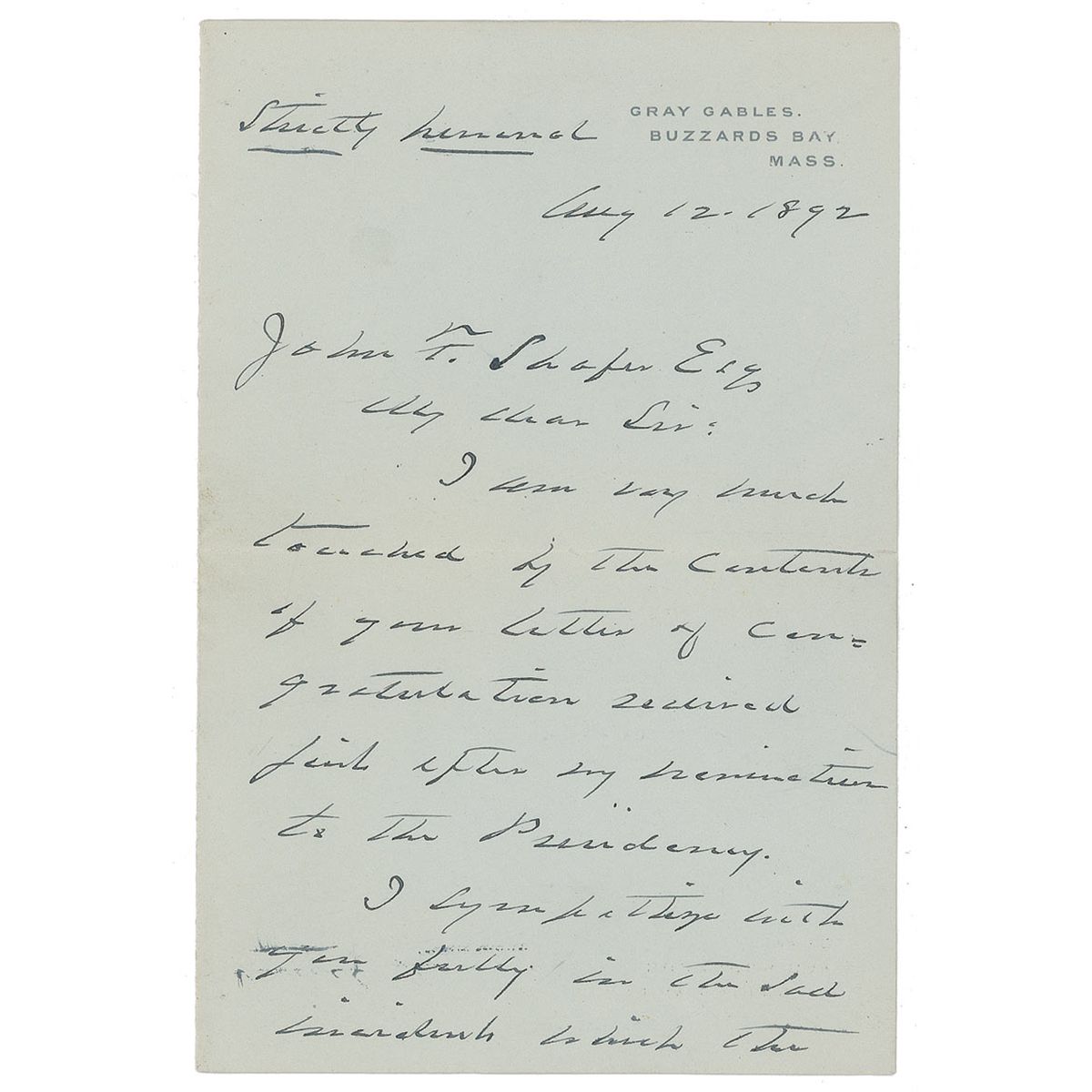 ALS, three pages on two adjoining sheets, 4.5 x 6.75, Gray Gables letterhead, August 12, 1892. Letter to John F. Shafer, marked at the top by Cleveland “strictly personal.” In full: "I am very much touched by the contents of your letter of congratulation received first after my nomination to the Presidency. I sympathize with you fully in the incidents in which the event brings to your mind. I have not been able to understand at all times, the devotion of children to a political party or candidate. It’s further from my…self interests, and its freshness is exceedingly interesting. I am glad to have the picture of my steadfast friend which you kindly sent me; and while I cannot thank you for your kind wishes I cannot stifle a regret that my candidacy should remind you of the affliction which you have suffered in the death of your son." In fine condition, with some minor light handling wear and soiling. Accompanied by the original mailing envelope, addressed in Cleveland’s hand.
