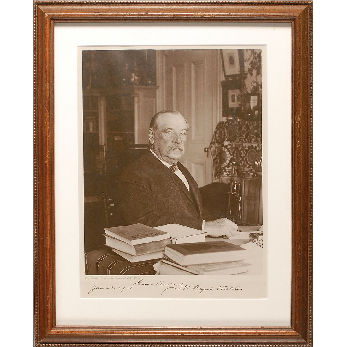 Vintage matte-finish 8.25 x 11 Underwood and Underwood photo of an older Cleveland behind his desk, signed and inscribed in the lower border in fountain pen “Grover Cleveland to Bayard Stockton, Jan 28, 1906.” Matted and framed to an overall size of 12.5 x 15.25. A few scattered light creases, as well as scattered light silvering to darker portions of image, otherwise fine condition. The consignor notes that this item originates from the estate of the late Senator Thomas Eagleton. A distinguished image, scarce in oversized examples.