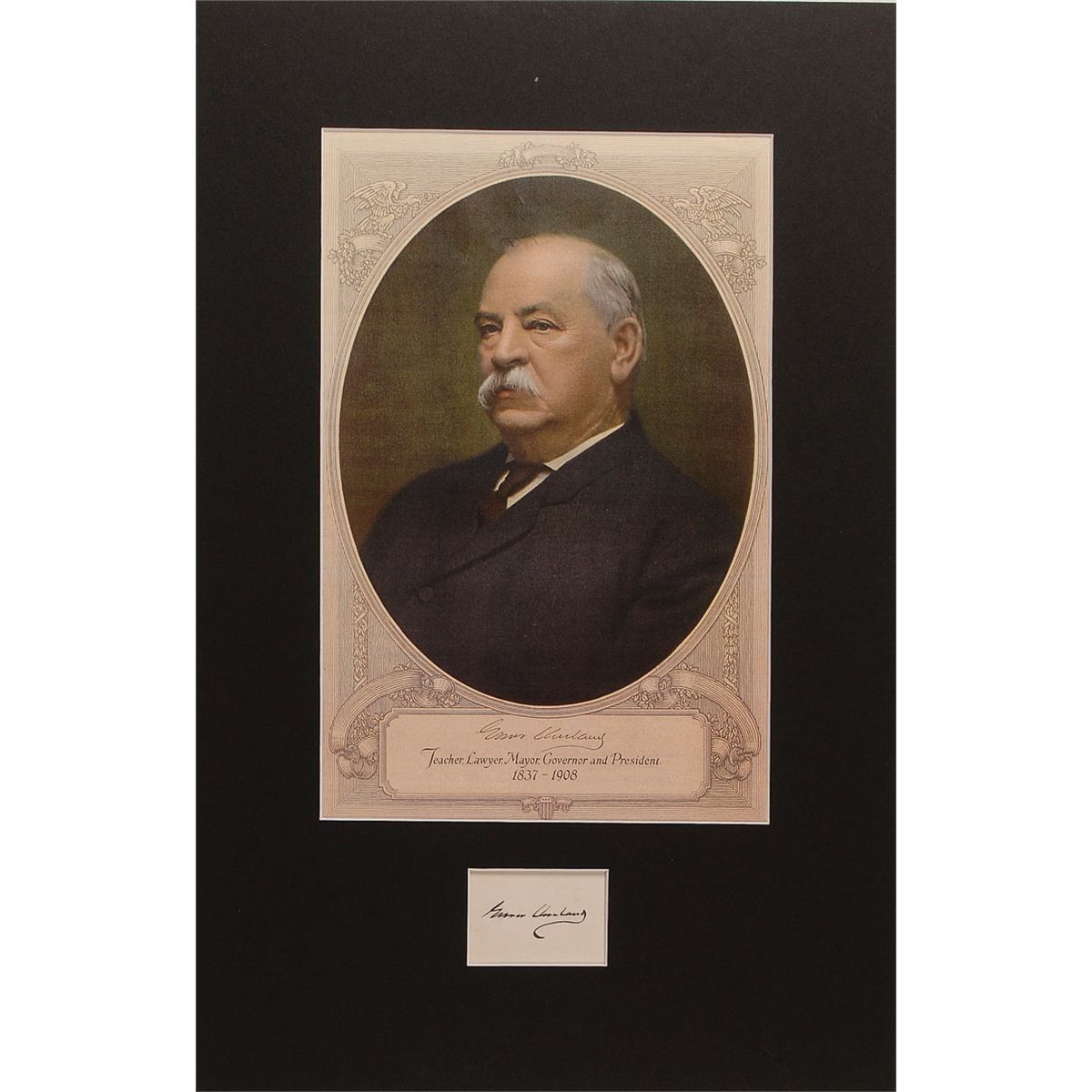 Crisp and clean ink signature, “Grover Cleveland,” on an off-white 2 x 1.5 slip. Matted with an color image of Cleveland, to an overall size of 10.75 x 16.5. In fine condition.