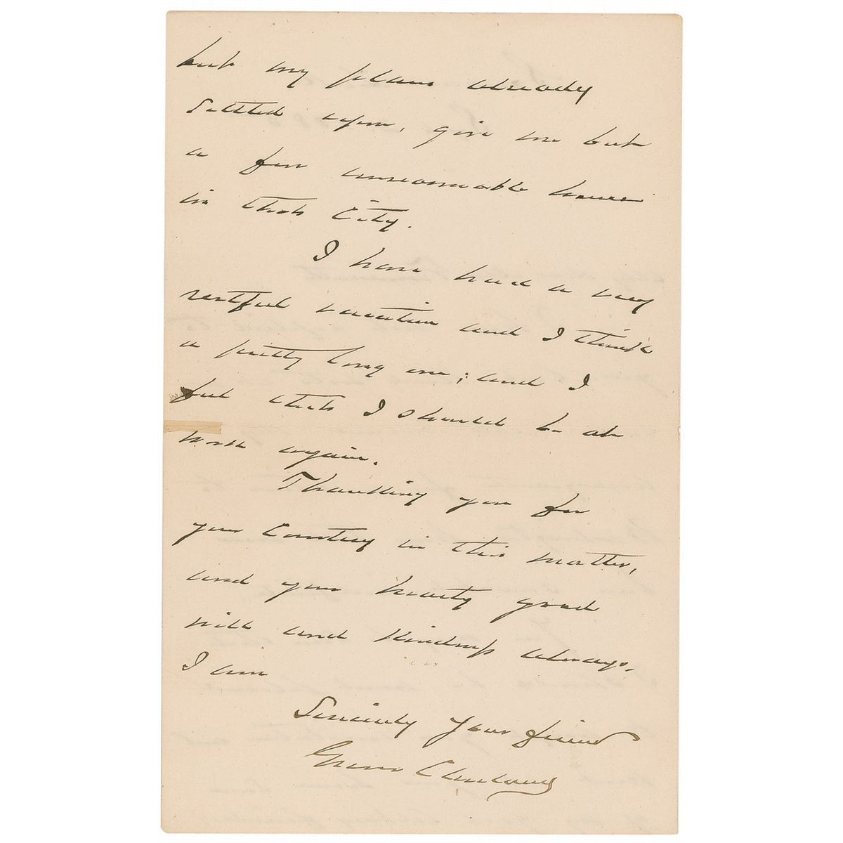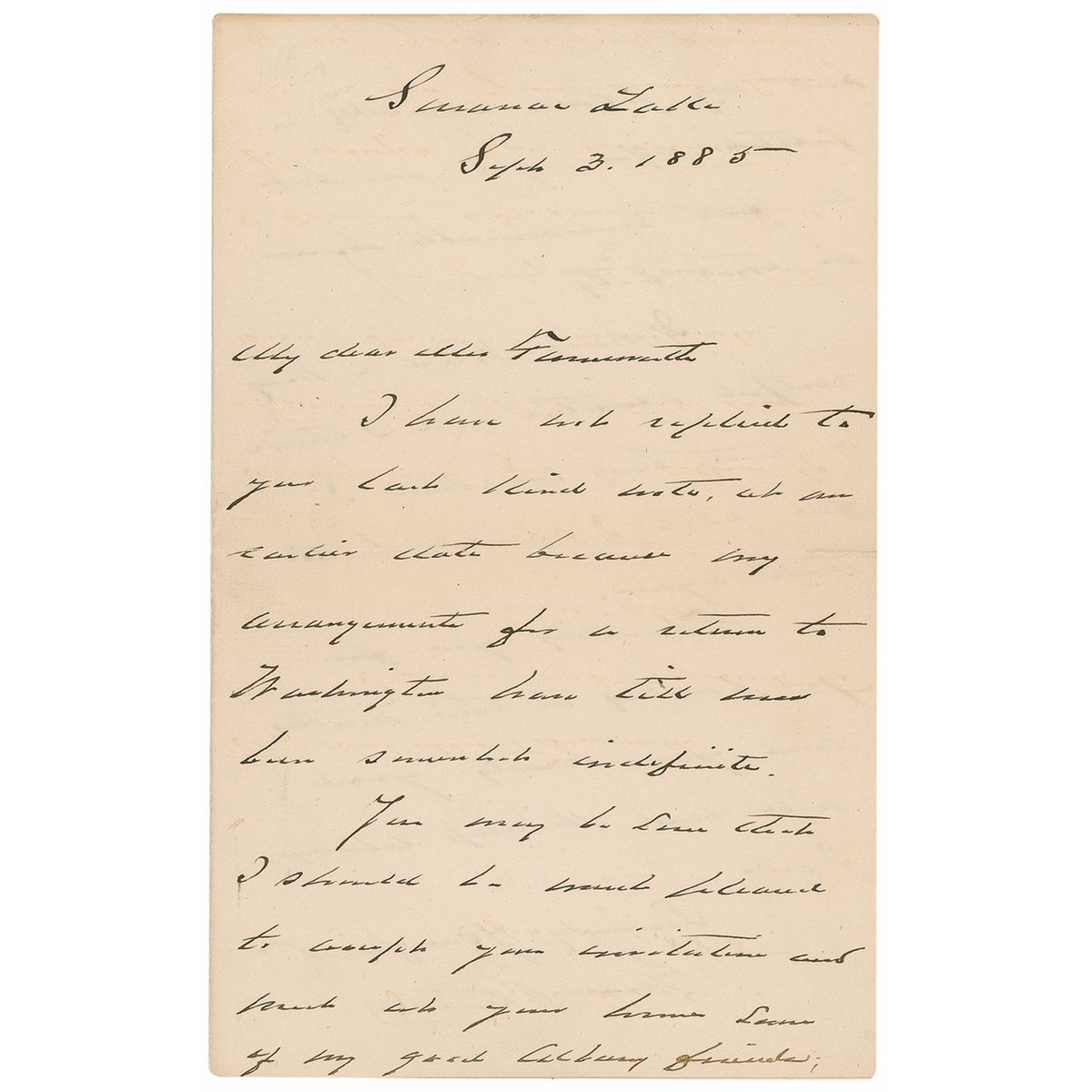 ALS as president, one page both sides, 5 x 8, September 3, 1885. From Saranac Lake, Cleveland writes to Mr. Farnsworth. In full: “I have not replied to your last kind note at an earlier date because my arrangements for a return to Washington have till now been somewhat indefinite. You may be sure that I should be most pleased to accept your invitation and visit at your home some of my good Albany friends, but my plans already settled before, give me but a few unreasonable hours in that City. I have had a very restful vacation and I think a pretty long one; and I feel that I should be at work again.” In fine condition, with small repair to central horizontal mailing fold, and some scattered light toning and soiling.