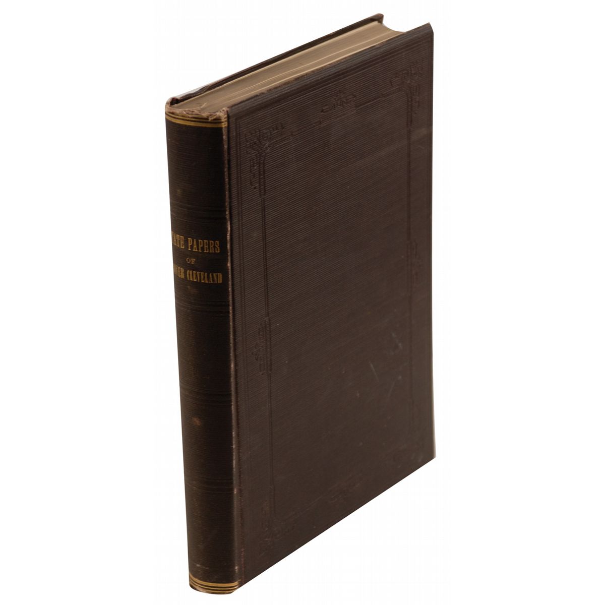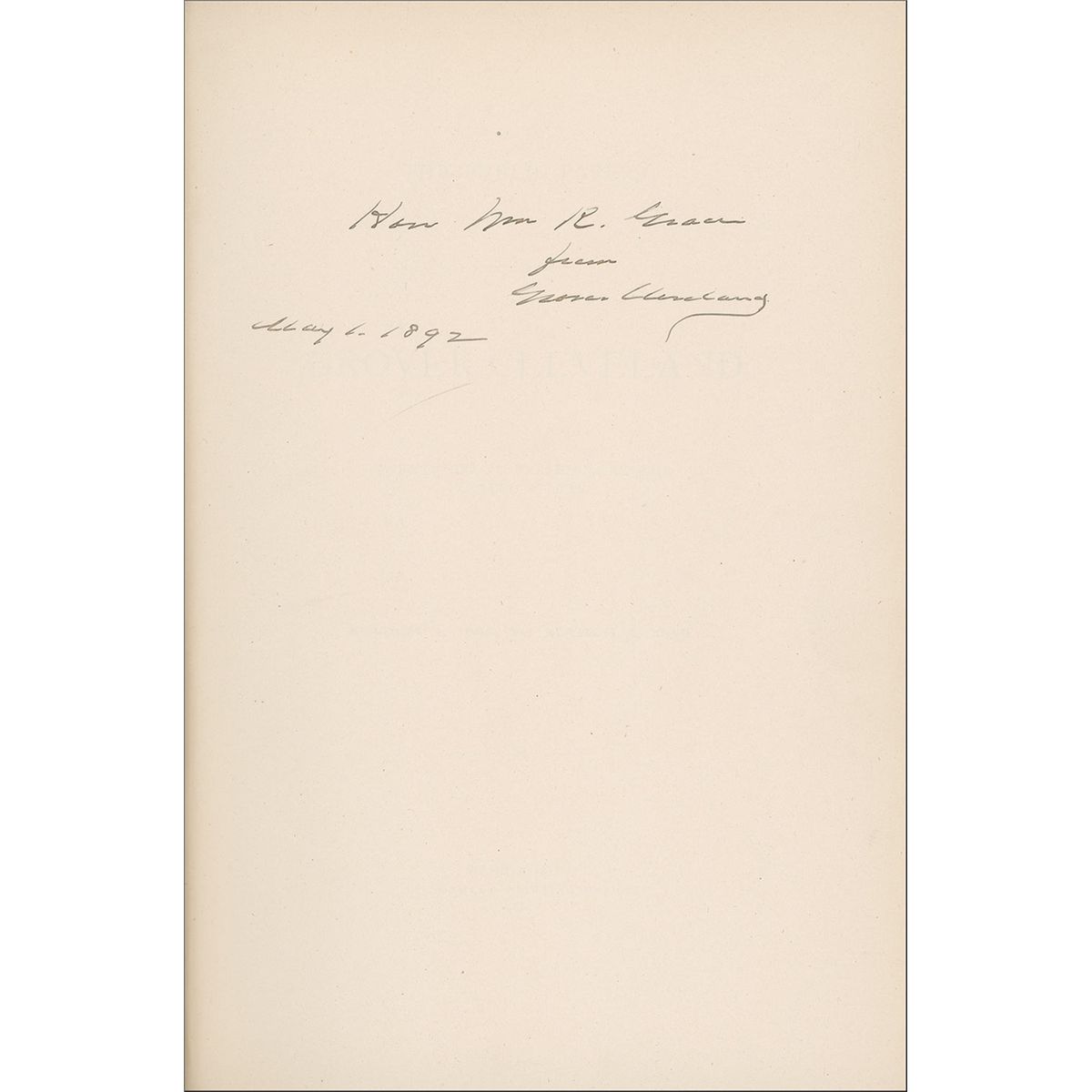 Signed book: State Papers of Grover Cleveland. Washington: Government Printing Office, 1889. Hardcover, 8.25 x 11.75, 578 pages. Signed and inscribed on the second free end page, “Hon Wm. R. Grace from Grover Cleveland, dated May 1, 1892.” In very good condition, with spine a bit weak, some light creases to opening pages, scattered wear and rubbing to covers, and fraying to head and tail.