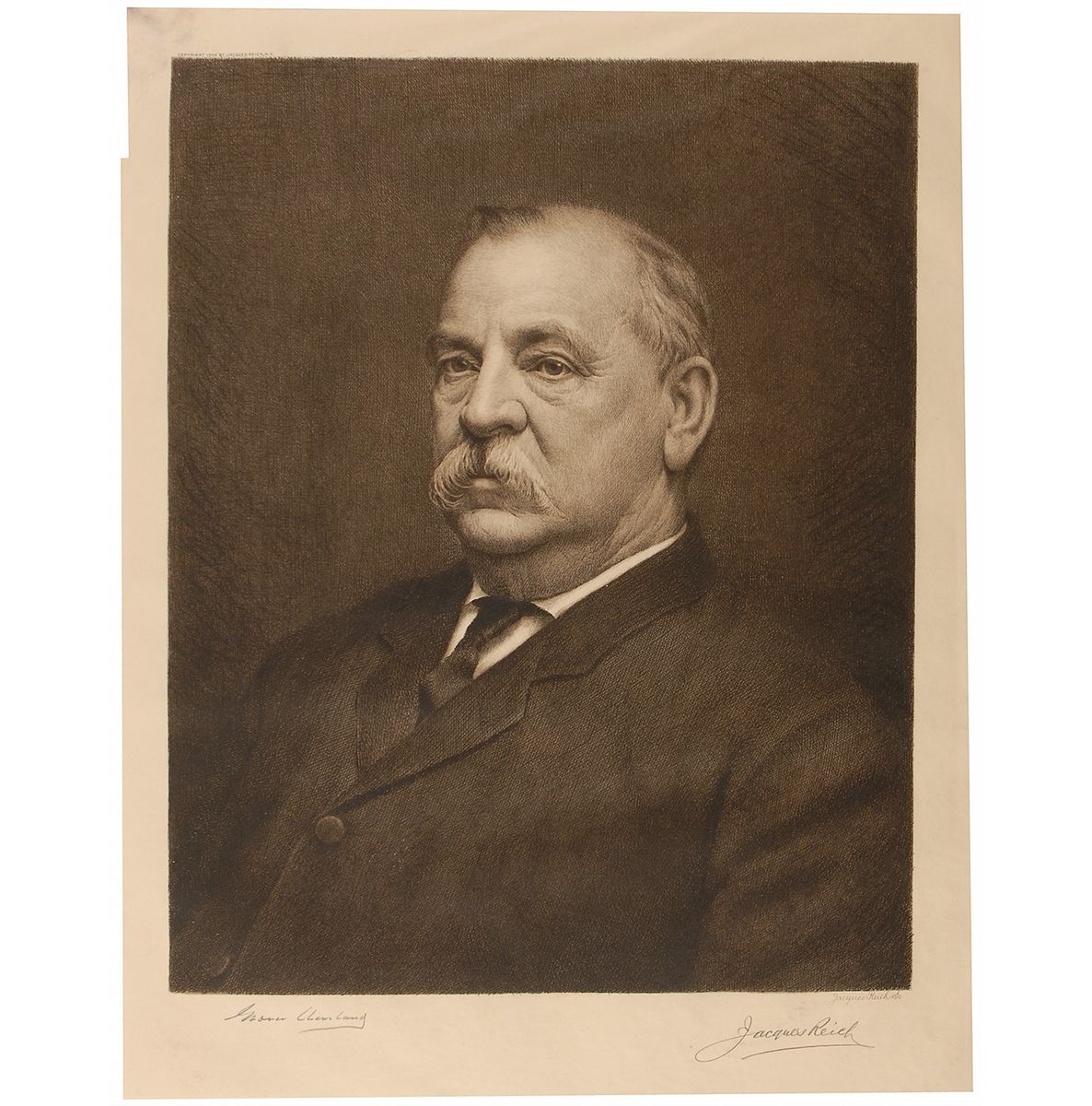 Impressive oversize 13 x 17 engraved portrait of Cleveland by Jacques Reich, signed in the lower border in pencil by Cleveland and also signed in pencil by Jacques Reich. Rippling to upper portion of engraving, lightly trimmed vertical edges, and a few other mild ripples, otherwise fine condition.
