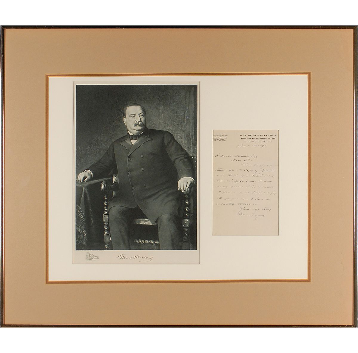 ALS, one page, 4.75 x 7.75, Cleveland’s law firm’s letterhead, March 10, 1890. A letter to author Sidney D. McCormick. In full: “Please accept my thanks for the copy of ‘Spoliation or the Follies of a Nation’ which you kindly sent me. I have hardly glanced at it yet, but I have no doubt I shall enjoy its perusal when I have an opportunity to read it.” Double matted and framed with an etching of Cleveland to an overall size of 26.5 x 22.5. In fine condition, with some slight separation to the edge of the upper fold. Oversized.