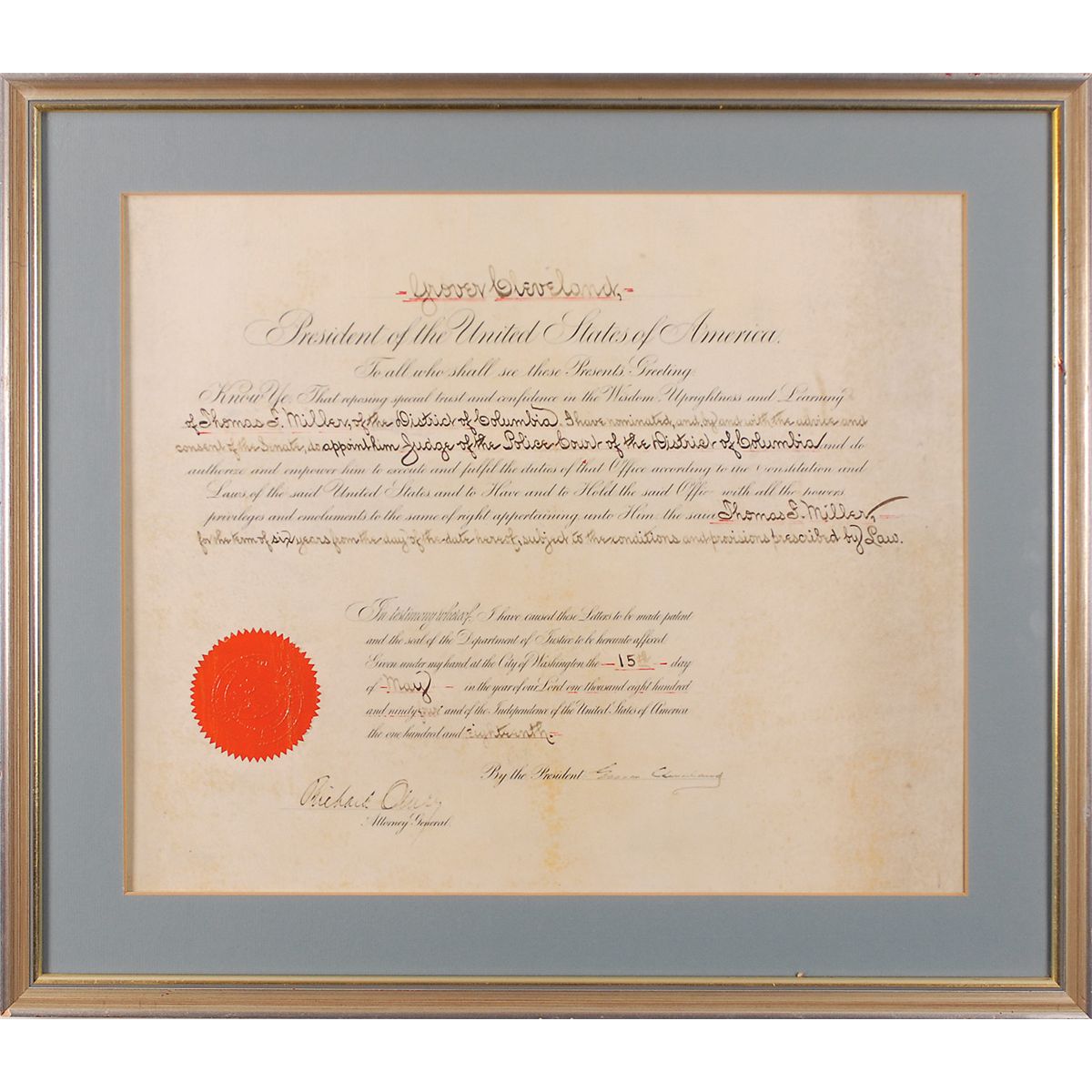 Partly-printed DS as president, one page, 17.5 x 15, May 15, 1894. President Cleveland appoints Thomas Miller “with the advice and consent of the Senate, do appoint him Judge of the Police Court of the District of Columbia.” Signed at the conclusion by Cleveland and countersigned by Attorney General Richard Olney. Matted and framed to an overall size of 23 x 20. In very good condition, with scattered toning and foxing, portions of the handwritten parts of the document professionally darkened, and Cleveland’s signature lightly faded, but still legible. The orange seal is intact with vertical creasing.