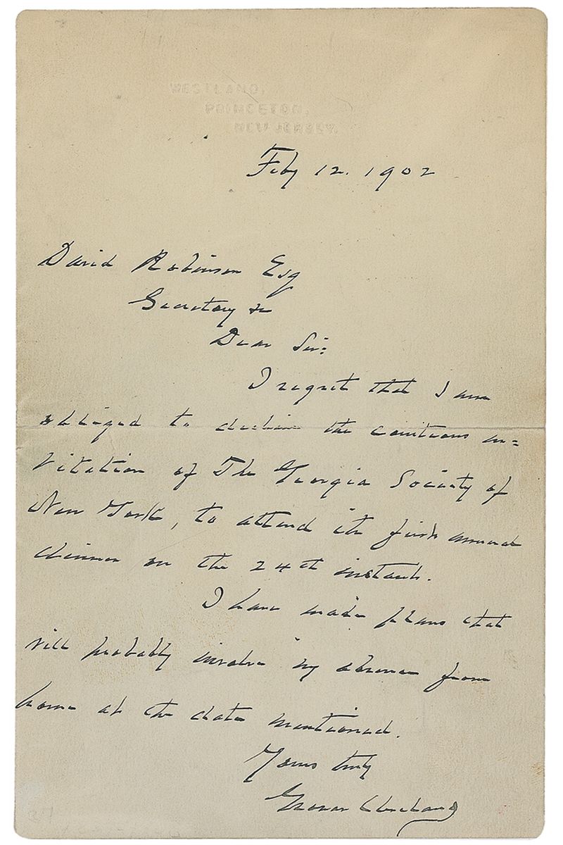 ALS, one page, 4.5 x 7, personal letterhead, December 12, 1902. Cleveland declines an invitation. In full: “I regret that I am obliged to decline the courteous invitation of the Georgia Society of New York, to attend its first annual dinner on the 24th instant. I have made plans that will probably involve my absence from home at the date mentioned.” Repairs to reverse of central horizontal fold, some scattered light toning and soiling, and mounting remnants to reverse of second integral page, otherwise fine condition.