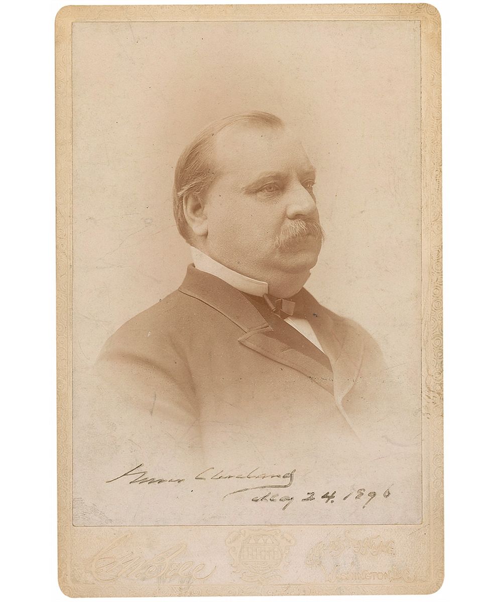 Original 4.25 x 6.5 cabinet bust portrait by C. M. Bell of Washington, D. C., signed on the image in black ink, as president, “Grover Cleveland, May 24, 1896.” In very good condition, with scattered surface marks and rubbing to image, toning and soiling to borders, and some light irregular ink adhesion to signature.