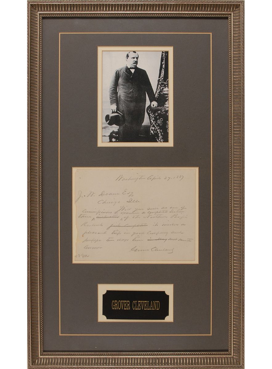 ALS, in pencil, one page, 7 x 5.5, April 27, 1887. Letter to J. W. Doane in Chicago. In full: “Will you serve as one of three commissioners to examine a completed section of the Northern Pacific Railroad. It involves a pleasant trip in good company and perhaps ten days time next month. Answer.” Matted and framed with a portrait of Cleveland and a name plaque to an overall size of 13 x 22. In fine condition, with a central vertical fold passing through a single letter of signature and light paper loss to left edge.