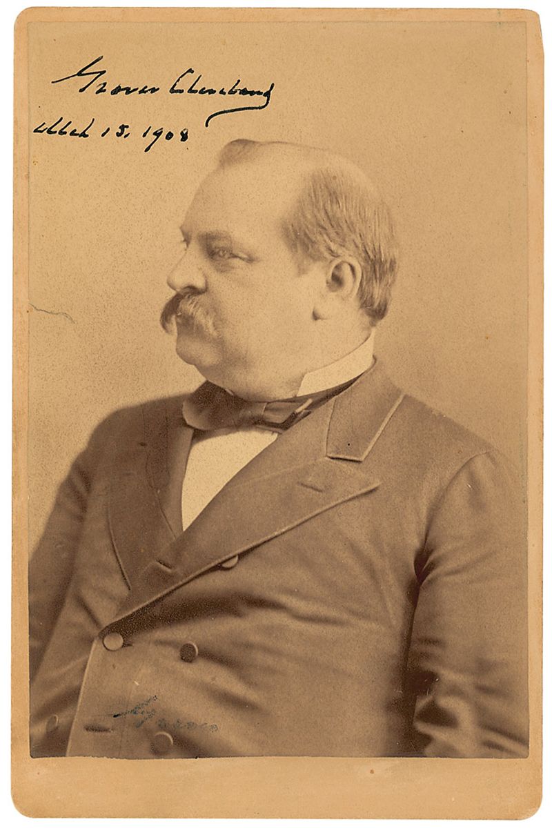 Original 4.25 x 6.5 cabinet photo by B. F. Powelson of Buffalo, signed in the upper left in black ink, “Grover Cleveland, Mch. 15, 1908.” Cleveland began signing at the bottom of his jacket, which remains only slightly visible, and a newspaper article regarding his 71st birthday celebration is affixed to the reverse. In fine condition, with a superficial tear to the left border of the image (the mount unaffected), and the upper right corner of the mount trivially clipped. This is a terrific specimen with a sharp, youthful image and bold signature, penned just three days before his 71st birthday and three months before his death.