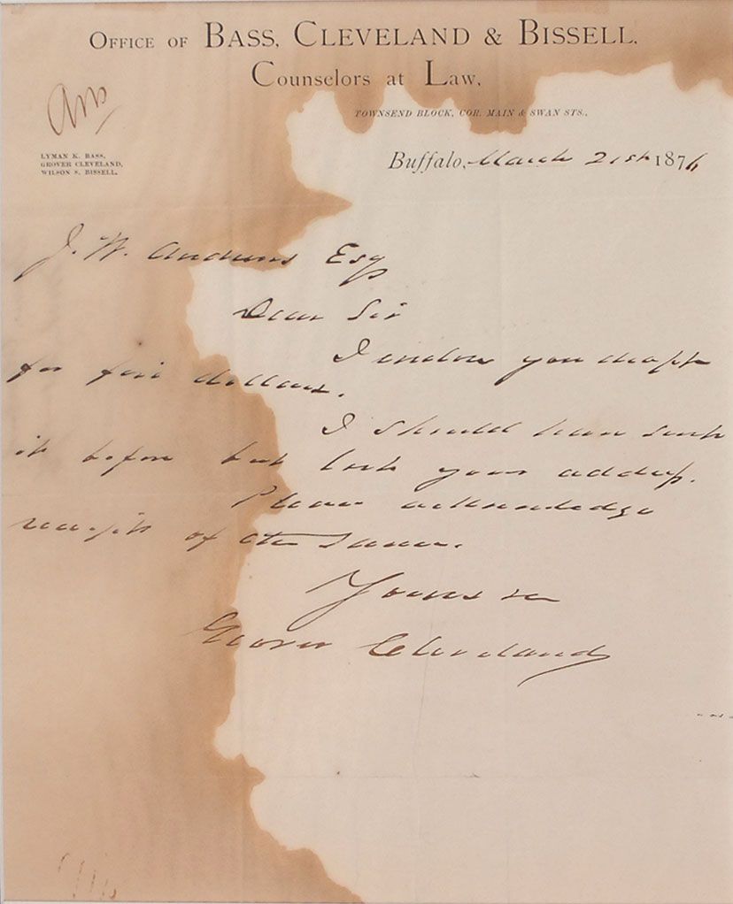 ALS, one page, 7.5 x 9.5, Office of Bass, Cleveland, & Bissell letterhead, March 21, 1876. Cleveland forwards five dollars to a gentleman. In part: “I enclose your draft for five dollars. I should have sent it before but lost your address.” Double-matted and framed to an overall size of 13 x 15. In good condition, with intersecting folds, two through single letters of signature, heavy dampstaining to left and top edges, affecting portions of text and overall appearance, and a vertical crease through another letter of signature.