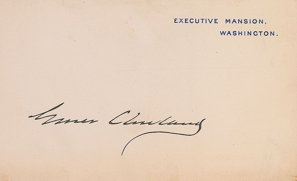 Executive Mansion card signed in black ink, “Grover Cleveland.” In fine condition, with mild overall toning.